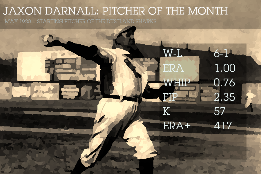 ![]() What a month for the 23 year old catcher! Lehn was on fire in May -- a month that included a 23 game hit streak and a 3 home run game against the Northlands Polar Bears -- with the third of those home runs tying the game and forcing extra innings (the Sharks will go on to win). After Whiskeytown Catcher Joel de Vries won last month we're in for an interesting battle to see who can establish themselves as the premiere catcher in the league. ![]() Jaxon Darnell wins his second pitcher of the month award and was even better this month than he was in April! May included his no-hitter and another two complete game shutouts. He also announced a 5 year contract extension with the Dustland Sharks to potentially take keep him in Shark colours until his age-37 season.