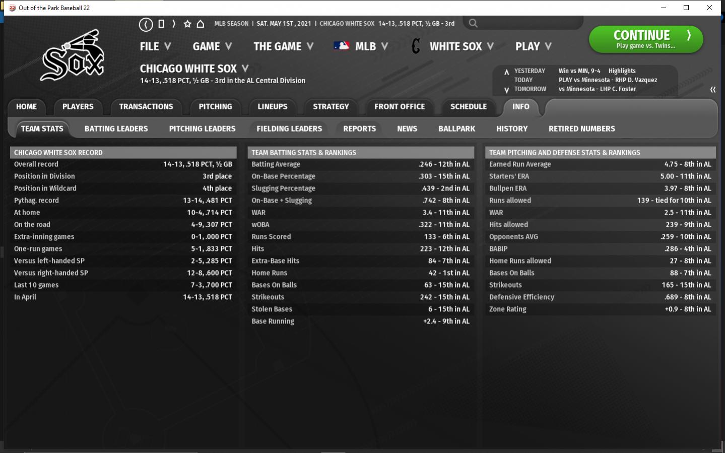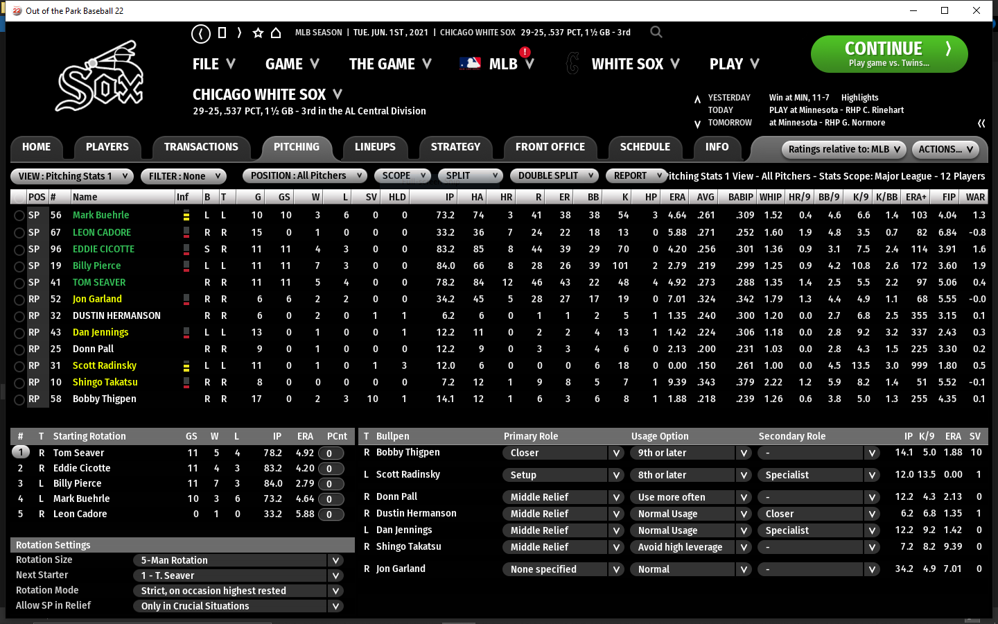 We are a young team with 2 rookies in the rotation and a young Billy Pierce. Thomas, Baines, Guillen, Ward & Kreevich are all rookies. Alomar has seen his best days. Along with 5 Sox players i do have several fictional players for injury purposes. For now injuries are set to low. After the draft i'll put it at normal. We have the best overall minor league system. OD roster. I'm going to sim most of the season.