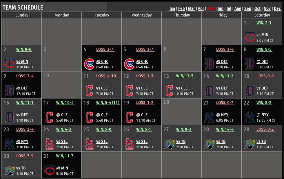 15-12 in May, 29-25 . 537 1½ GB AL Central tied for AL Wildcard.