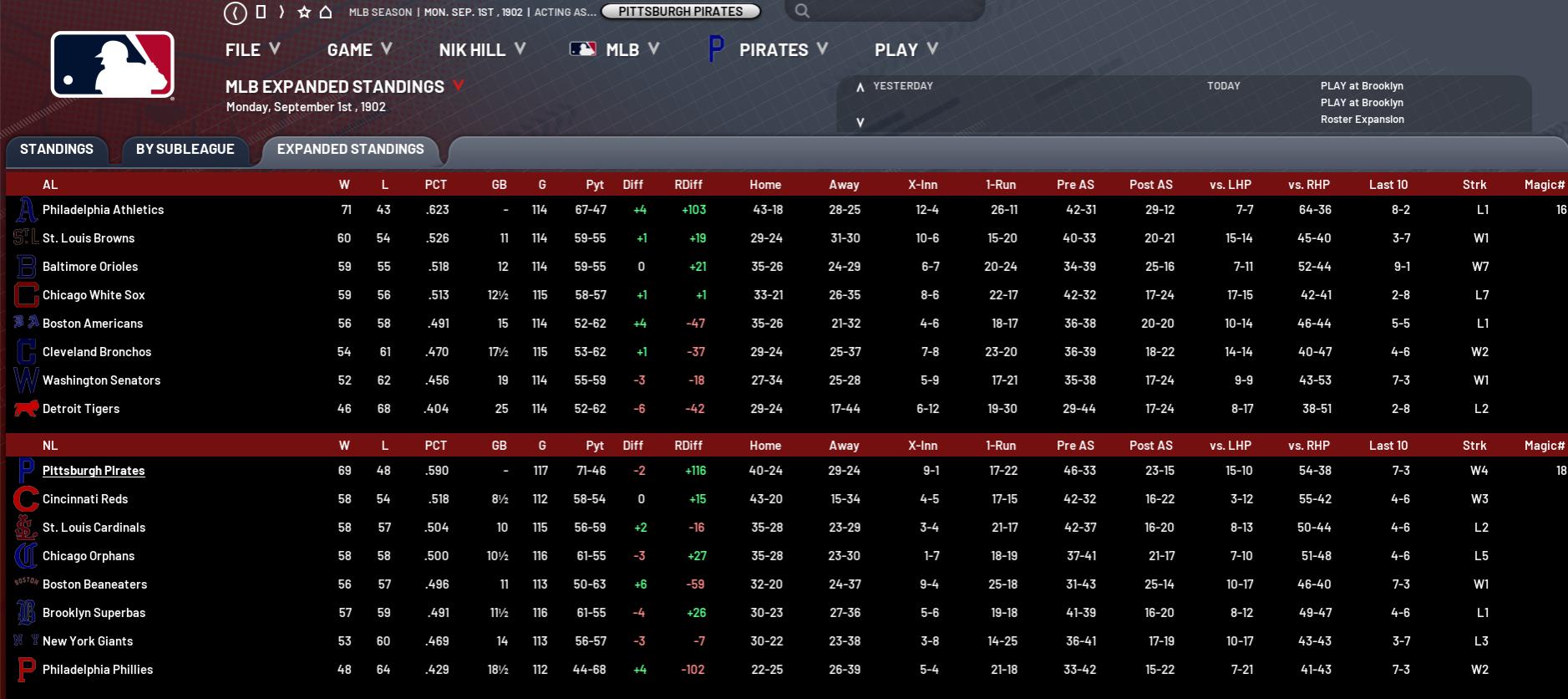 We go on a decent enough run in that period, winning seven of our next ten, but Owen’s continued poor form forces my hand and I move McJames into the rotation in his place. Our strong form continues over the next couple of weeks, allowing us to hold our destiny in our own hands. We are helped in this regard by Cincy’s seemingly uncanny ability to lose whenever we do (which I’d be quite happy for them to keep doing for the duration!) and somewhat inconsistent form by the others still within range. We just taper off ever so slightly in the next-to-final week of August, and I decide to try and keep morale up by locking down a few players for next season and beyond. With Wagner, Phillippe and Chesbro already under lock and key via the Legacy Player rules (every Legacy is signed for 10 years at a rate based on their IRL earnings with a no-trade clause imposed; Wagner, for example, gets $61k over that period), I first sit down and talk with Steinfeldt, Williams, Murphy, Dexter, O’Neill, McIntyre and Altrock—each of whom is offered a multi-season contract ranging between three and five years. Next, Seybold, Schreckengost, Malarkey, Owen, Maloney, McJames are each offered single-year deals. By month’s end almost half have agreed to terms and hopefully there’ll be no hiccups with the rest. It seems to have the desired effect, and two sterling performances in particular from this period deserve mentioning. Mike O’Neill, having another excellent campaign, pitches a 10-inning three-hitter and delivers the offensive punch with a 3-run walkoff dinger to get us home 3-0 against Boston. The very next game, Phillippe notches his 20th win for the season in fine style, shutting out the Beaneaters on 5 hits and outduelling the great Rube Waddell for a 1-0 squeaker. And so, after a home sweep to round off an 18-8 month, we are 8½ games clear of a bunched field led by the Reds, with a 69-48 overall record. Hot / Not