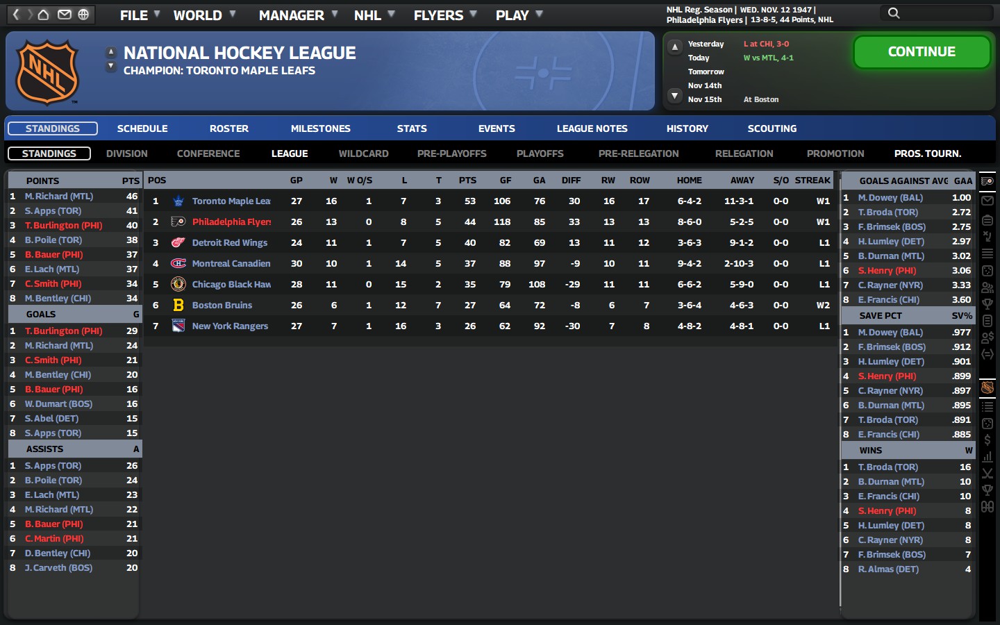 11/21: PHI 8, CHI 1; Goals- CHI: M. Bentley (21), PHI: Evanshen (6), Halder (6), Smith (27), Rittinger 2 (9), Rouse 2 (3), Stearns (11); A- 6,460 Another dominating effort from the Flyers, scoring 3 in the first and third periods. 11/25: PHI 4, NYR 2; Goals- PHI: Smith (28), Rittinger 2 (11), Stearns (12), NYR: Johnston (1), Gardner (7); A- 6,359 The Flyers come back from a 2-0 first period deficit with four unanswered, with another great goaltending effort from Sugar Jim Henry. 11/28: DET 3, PHI 2; Goals- PHI: Evanshen (7), Bauer (17); DET: Bruneteau (7), Conacher (10), Stewart (3); A- 13,783 In a crazy game between backup goalies with 135 shots between the teams, a league record, Detroit ends up with the victory as Jack Stewart pockets the winner with 2:23 to play. Philly is holding the lead in 2nd by a scant two points. Last edited by Sctvman; 01-14-2025 at 12:44 AM. |
