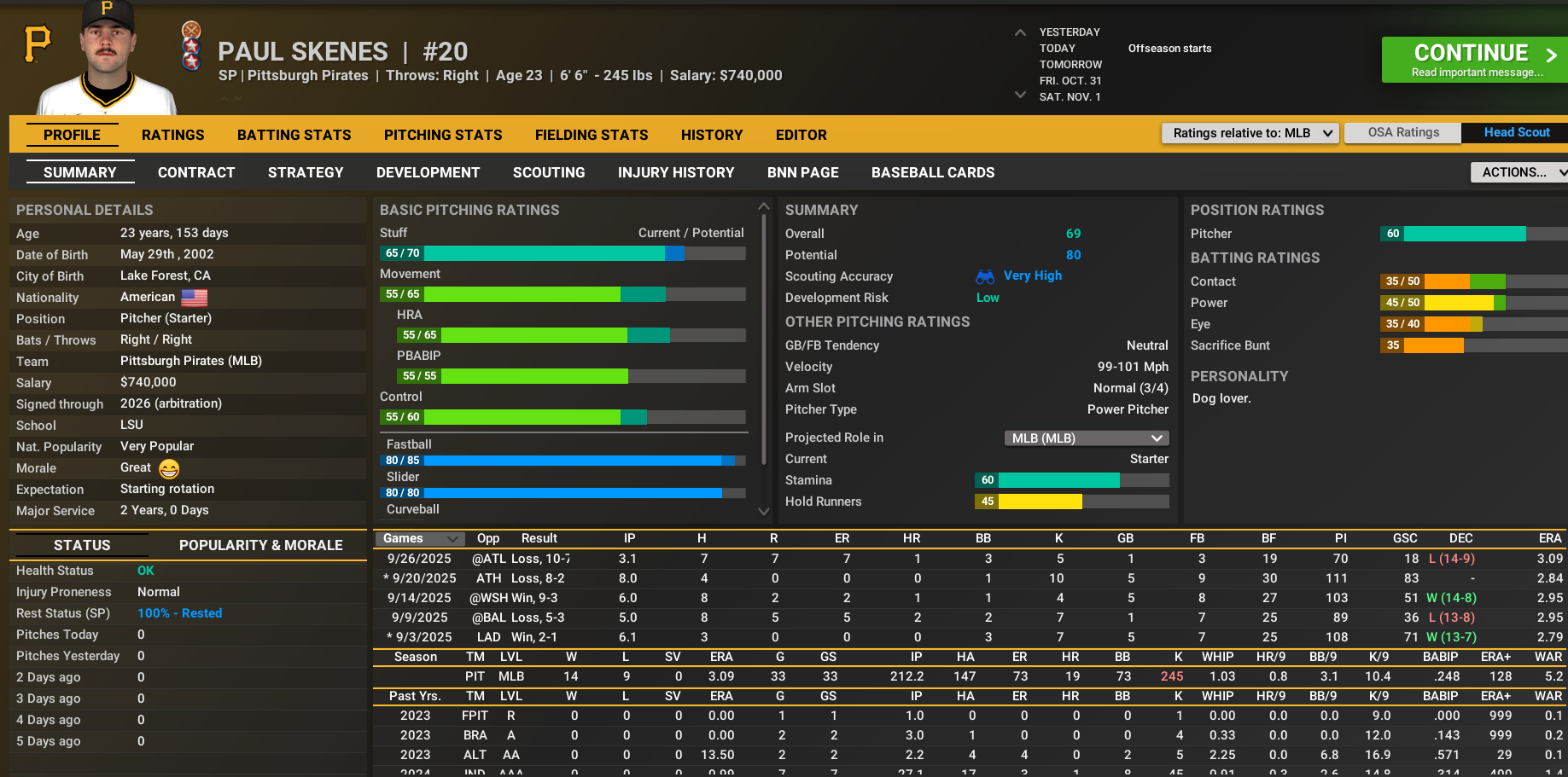 SP Paul Skenes (1 year) - I would've signed him to more if I could. RP Caleb Ferguson (3 years) RP David Bednar (1 year) - He will be our closer next year since Williams did quite poorly with us. SP Jared Jones (1 year) - May be his last year if he can't improve, his ERA was awful in our 2025 campaign. C Joey Bart (1 year) - Despite not seeming to have an amazing year, he did lead our team in WAR, so there's clearly something to him. SP Braxton Ashcraft (1 year) 2B Spencer Horwitz (1 year)