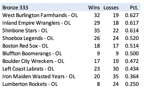 It's a big day (month) in Bronze. Shinbone is still on top, but their August schedule includes 17 OL contests, including six against nemesis Left Coast and six against second-place West Burlington. The Stars have split their 10 games this season against the LabRats. The battles with the Farmhands will be their only meetings of the season.