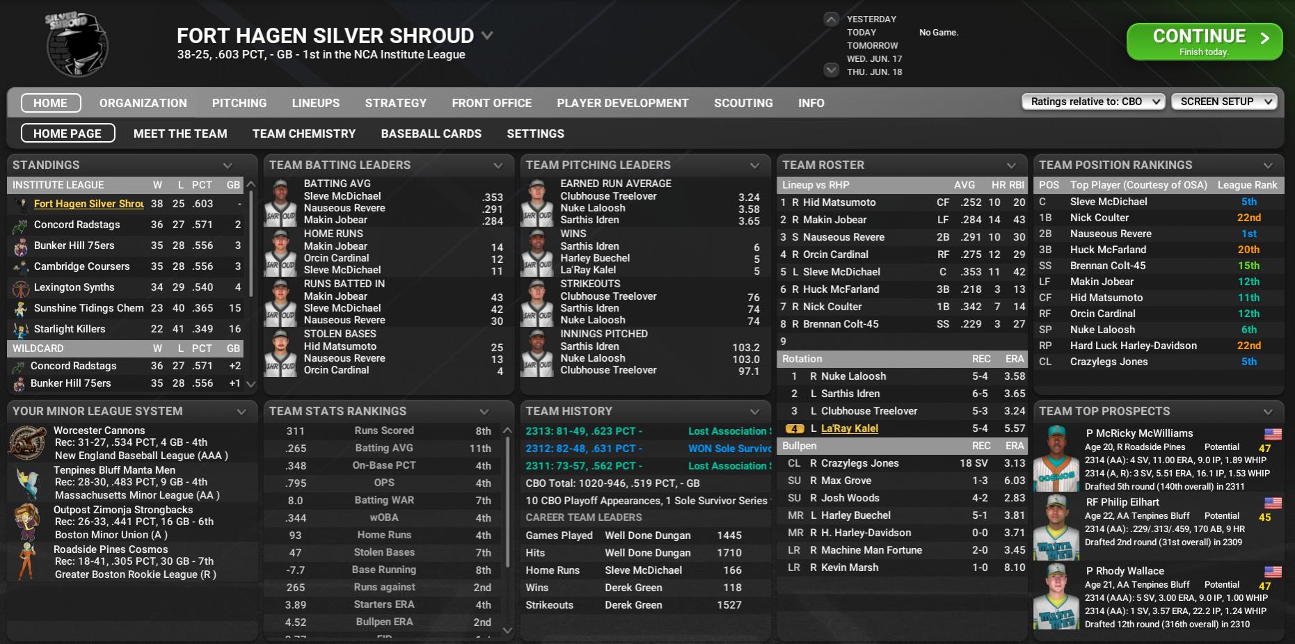 BNN Report News from the CBO, Minors, CCBL, and CYL by Nat Wright-Kawolski 15 June 2314 CBO Analysis We are not quite at the midway point of the season since we are 10 weeks into a 21-week season. But this is the midway point update, meaning our annual foray into the contenders vs pretenders. With nearly 65 games played in the 130-game regular season, only two teams--The Slog and Vault 81--have reached the 40-win mark, with two teams--Sunshine Tidings and Starlight--being the only teams with 40+ losses. We will break down the Power Rankings and the current Playoff Order below. Here are the current team power rankings for Commonwealth Baseball Organization: Teams (Total Points, Tendency): 1) Vault 81 Dwellers (131.9, +) 2) The Slog Ghouls (127.9, -) 3) Fort Hagen Silver Shroud (117.5, -) 4) FHE Yao Guai (114.7, +) 5) Diamond City Swatters (104.1, ++) 6) Concord Radstags (102.8, ++) 7) Bunker Hill 75ers (102.1, ++) 8) Oberland T-51s (101.1, ++) 9) Quincy Gunners (99.8, --) 10) University Point Deathclaws (97.8, --) 11) Cambridge Coursers (97.1, --) 12) Atom Cats (96.2, --) 13) Glowing Sea Radscorpions (96.1, o) 14) Lexington Synths (94.2, o) 15) Nordhagen Beach Party Boys (88.7, o) 16) Egret Ninjas (83.3, ++) 17) Southie Brews (83.2, +) 18) Roxbury Rad Sox (82.2, -) 19) Malden Grognaks (80.9, ++) 20) Salem Witch Hats (80.8, -) 21) Easy Town Assaultrons (78.8, --) 22) County Crossing Bloodbugs (74.4, ++) 23) Spectacle Island Reapers (70.5, -) 24) Sunshine Tidings Chemists (66.7, ++) 25) Jamaica Plain Red Rockets (66.5, -) 26) Starlight Killers (63.8, +) 27) Goodneighbor Hancocks (61.6, --) 28) Nahant Celtics (58.6, -) Current Playoff Order: NCA 1. The Slog 2. Fort Hagen 3. Concord 4. Bunker Hill (3-2 record vs Cambridge) 5. Cambridge (2-3 record vs Bunker Hill) 6. Lexington Unless something really goes right for other team--Nordhagen Beach is the 7th seed, four games back of the Synths--or awry for teams seeded, this will be the six playoff teams with maybe some jostling of order. The Coursers of all teams just made a blockbuster trade, which we will cover in the league updates below. SCA 1. Vault 81 2. Quincy (4-1 record vs University Point) 3. FHE 4. University Point (1-4 record vs Quincy) 5. Diamond City (6-4 combined record over Glowing Sea and Oberland) 6. Oberland (4-4 combined record over Diamond City and Glowing Sea) The SCA playoff race appears that it will be a good one with the Radscorpions currently the odd team out for three teams tied at seven games above .500. Atom has also started to make its move at just a game back of the wildcard spot. That puts eight teams legitimately in the playoff race and six teams needing to do something different to get into it. It is likely, though, that the eight teams currently in the race will be the top eight seeds in the end. Brotherhood League The Slog's lead continues to grow, now up 13.5 games on 2nd place Nordhagen Beach. Salem, Easy Town, and Malden are all right on the Party Boys' tails with County Crossing and Nahant taking up the rear. In the BL, really the Ghouls are the only contending team. The rest of the league has been inconsistent, though all of places 2nd-6th have been hovering around .500 in their last 10, pushing them all up from where they were 10 games ago. The Celtics have struggled mightily and trading away their ace Zach Million in the offseason now leaves them with a huge pitching gap that they have not been able to overcome in 2314. The Boys are back? Well, they are looking much better, which begs a second question. Why did they trade away their best player over the weekend? Cambridge and Nordhagen Beach came to a huge deal that sent C Clownie Blammo (.279/6/31) to the Coursers for outstanding CF prospect Miky Mytook, and prospects 2B Packy Dillan and RF Gram Baylor. Nordhagen Beach, which is 9th in runs scored (309) is now without one of its best offensive threats and a great defensive catcher. The Party Boys do still have 1B Slammin' Sammy Holloway (.357/16/59) and RF Mork Mendee (.294/15/47) in the middle. But will they be enough? Nordhagen Beach is 5th in runs allowed (294), which keeps them in the playoff hunt for now. Ace SP Beachboy Nut (6-3, 3.64) still is the team leader with Deedee Martinson (5-5, 3.64) who appears in the Noteworthy News section helping. CL Yank Daley (17 SV, 3.60) has been decent but not dominant. Institute League Just last week, the top five teams were all within a game of 1st place. Since then, there has been some separation with the hot Fort Hagen Silver Shroud taking over first place. They are now two games up on 2nd place Concord. Bunker Hill and Cambridge are tied for 3rd with Lexington at 5th. Easy breakdown of contenders (the five named above) to the CBO's two worst teams and IL's current punching bags, Sunshine Tidings and Starlight. The Killers are actually on a three-game winning streak to place them back near the pack for the race to the CBO's #1 overall draft pick. The Shroud have flexed their muscles and seem to be back to their winning ways. Their 8-2 mark in the past 10 ties FHE for the CBO's best run in the last 10 games. Offense has not been Fort Hagen's strength, currently 8th in runs scored, partially because of the 11th-ranked batting average (.265). Only C Sleve McDichael (.353/11/42) is above .300 right now for those eligible with enough at-bats. 1B Nick Coulter (.342/7/14) has been good in limited action. On the mound, the Silver Shroud are 2nd in runs allowed (265), with the 4th-best Starters ERA (3.89) and 2nd Bullpen ERA (4.52). The three top starters all have ERAs below 4.00: Nuke laloosh (5-4, 3.58), Sarthis Idren (6-5, 3.65), and Clubhouse Treelover (5-3, 3.24). CL Crazylegs Jones (18 SV, 3.13) has been about average. Minutemen League No team is "hot" in the ML with Atom having the best ten-game stretch of 6-4. They are currently on a three-game losing streak, including two right now to the Shroud. Quincy and University Point, both 4-6 in their last 10 are tied