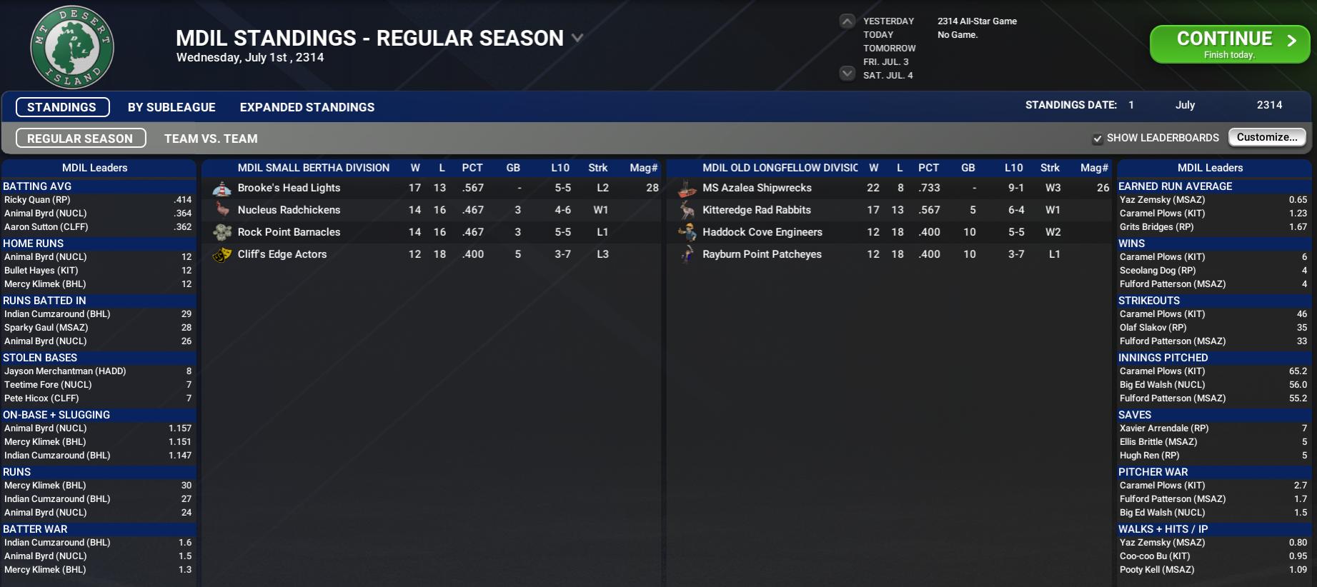 ---------------------------------------------------------- Nuka News Update Reporting on the NWL, APL, NWLR, and BBL Leagues by Evan Guy 1 July 2314 Wild, Cherry Lead at the Break The All-Star Game was played just last night--story below--and so we are just two days away from the second half of the 2314 Nuka World League season. At the break, the Wild Gatorclaws hold a three-game lead in the North Bradberton, while the Cherry Ghoulrillas are division leaders of the South Bradberton. Orange's RF Doman Northsea (.393/15/45/3.5 WAR) and Victory's SP Mucky Timmons (7-3, 2.46, 2.9 WAR) appear to be the early leaders for the top awards in hitting and pitching. Speaking of Northsea, he said he hopes everyone remembers his performance in June if he ends up struggling this year. His performance certainly was memorable, as the 29-year-old Orange Tourists right fielder was a step ahead all other Nuka World League hitters and was named Batter of the Month. On the month, he hit .453 with 10 home runs, 21 RBIs and 24 runs scored. Northsea is hitting .393 so far this season with 45 RBIs and 38 runs scored. He has 75 hits including 15 home runs, 24 walks and .460 OBP. June's premier pitcher was Melvin Teacup of Victory Cave Crickets. He pulverized Nuka World League hitters all month long and picked up the Pitcher of the Month award. The Cave Crickets star hurler fashioned a 5-0 record en route to the honor. He had 35 strikeouts in 42 innings and compiled a 2.36 ERA. Other clubs hit .219 against him. For the season, Teacup has compiled a 9-0 record with a 2.19 ERA. Bah Gamnan is still a bit shy, but then, who could blame the newest Nuka World League Rookie of the Month honoree? He hasn't been around the league long enough to fully know the ropes yet, despite the fact that he's putting up veteran-like numbers. In June the Quartz hitter tagged opposing pitching for a .294 average with 30 hits, 1 home run and 6 RBIs. This season in 47 games, Gamnan has hit at a .292 clip with 56 hits, 2 home runs, 19 RBIs and 25 runs scored. Roz McBerger shined brightly tonight against the best talent that the NWL has to offer. The all-star was named MVP for the annual mid-season showcase held at Fizztop Mountain Park at Nuka-Town USA, as his North Bradberton Division All-Stars downed the South Bradberton Division All-Stars by a count of 7-4. "It's humbling to even play in a game like this with legends of the sport all around you," he said. McBerger went 2 for 2 to capture the honor. His career numbers show McBerger is currently carrying a .378 lifetime batting average with 40 home runs and 210 RBIs. Half of the season has been played and now it's time for the All-Star game! It's a game where the fans will get to see their favorite players compete on the same field together, a game where the players themselves become fans and all of baseball comes together to celebrate one of the great traditions of the game -- the Nuka World League All-Star game. The North Bradberton Division and the South Bradberton Division will come together today to decide the title of the best league for this season. Here are the talented stars on the North Bradberton Division roster: SP Fred Johnson (QUAN) - 7-1, 3.20 ERA, 56.1 IP, 1.37 WHIP, 4.6 K/9, 1.1 WAR SP Dom Marichal (GRAPE) - 4-0, 2.64 ERA, 61.1 IP, 0.91 WHIP, 7.0 K/9, 1.2 WAR SP Culhwch Olwen (QUAN) - 4-6, 3.79 ERA, 57.0 IP, 1.40 WHIP, 6.8 K/9, 0.9 WAR SP Justin Quast (WILD) - 5-2, 3.80 ERA, 71.0 IP, 1.46 WHIP, 5.3 K/9, 1.0 WAR SP Tony Softhands (VIC) - 4-0, 4.21 ERA, 72.2 IP, 1.62 WHIP, 5.8 K/9, 1.9 WAR SP Melvin Teacup (VIC)* - 9-0, 2.19 ERA, 86.1 IP, 1.14 WHIP, 6.4 K/9, 2.4 WAR SP Mucky Timmons (VIC) - 7-3, 2.46 ERA, 80.1 IP, 1.11 WHIP, 8.0 K/9, 2.9 WAR RP Crayon Factory (WILD) - 5-0, 2.57 ERA, 28.0 IP, 1.29 WHIP, 4.5 K/9, 0.1 WAR RP Cantalk Hitt (WILD) - 3-0, 2.14 ERA, 21.0 IP, 1.05 WHIP, 5.6 K/9, 0.3 WAR RP Ricky McFarland (GRAPE)* - 1-0, 0.57 ERA, 15.2 IP, 0.70 WHIP, 4.6 K/9, 0.6 WAR RP Will Wylde (WILD) - 2-1, 3.14 ERA, 28.2 IP, 1.60 WHIP, 4.7 K/9, 0.3 WAR CL Lionel Minelli (WILD) - 1-0, 16 SV, 0.46 ERA, 19.2 IP, 0.81 WHIP, 5.5 K/9, 0.8 WAR C Jax Canadian (VIC)* - .279/.362/.426, 129 AB, 5 HR, 91 wRC+, 0.9 WAR C Griff Ledru (WILD) - .268/.423/.512, 41 AB, 2 HR, 139 wRC+, 0.5 WAR C Brook Lynn (GRAPE) - .241/.278/.308, 133 AB, 2 HR, 39 wRC+, -0.0 WAR 1B Buck Crosby (VIC) - .352/.386/.503, 145 AB, 4 HR, 1 SB, 122 wRC+, 0.5 WAR 1B Geecee Metal (GRAPE)* - .375/.429/.549, 184 AB, 9 HR, 156 wRC+, 1.4 WAR 1B Fried Tatos Smith (WILD) - .378/.418/.500, 196 AB, 2 HR, 3 SB, 143 wRC+, 1.6 WAR 2B Mound Barkley (WILD) - .342/.392/.521, 73 AB, 2 HR, 140 wRC+, 0.3 WAR 2B Ah Oona (GRAPE) - .314/.389/.517, 172 AB, 5 HR, 1 SB, 132 wRC+, 1.2 WAR 2B Bubba Shrimp (WILD)* - .382/.420/.688, 157 AB, 8 HR, 2 SB, 175 wRC+, 2.5 WAR 3B Ruins Rogers (GRAPE)* - .325/.360/.578, 83 AB, 6 HR, 133 wRC+, 0.7 WAR SS Cameron Hicks (GRAPE) - .309/.335/.400, 175 AB, 3 HR, 86 wRC+, 0.5 WAR SS Nosy Schnozz (QUAN)* - .304/.368/.495, 184 AB, 8 HR, 2 SB, 123 wRC+, 1.5 WAR LF David Mabry (WILD) - .373/.441/.475, 59 AB, 1 HR, 4 SB, 132 wRC+, 0.8 WAR LF Ness Ninten (VIC) - .352/.404/.615, 91 AB, 3 HR, 3 SB, 159 wRC+, 1.0 WAR LF Durable Robinson (GRAPE) - .301/.386/.438, 176 AB, 6 HR, 3 SB, 111 wRC+, 0.8 WAR LF Jake Roth (QUAN) - .318/.429/.555, 110 AB, 6 HR, 7 SB, 157 wRC+, 1.4 WAR LF Brown Eyes Tarberry (WILD) - .333/.350/.500, 120 AB, 4 HR, 1 SB, 119 wRC+, 0.3 WAR CF Mystery Echo (WILD)* - .345/.433/.546, 174 AB, 2 HR, 2 SB, 157 wRC+, 2.3 WAR CF A-Train Gilmore (VIC) - .269/.362/.473, 182 AB, 10 HR, 20 SB, 111 wRC+, 2.1 WAR RF Hicky Loftin (WILD)* - .319/.337/.505, 182 AB, 8 HR, 16 SB, 114 wRC+, 1.9 WAR (Injured) RF Roz McBerger (VIC)* - .361/.410/.544, 169 AB, 7 HR, 1 SB, 141 wRC+, 1.0 WAR RF Jukie Robbins (QUAN) - .307/.346/.443, 192 AB, 4 HR, 23 SB, 103 wRC+, 1.7 WAR And these are the gifted players for the South Bradberton Division: SP Fick Aragvsky (CHER) - 3-1, 4.04 ERA, 62.1 IP, 1.25 WHIP, 6.1 K/9, 1.4 WAR SP Chris Montgom