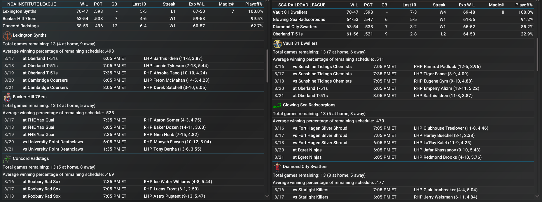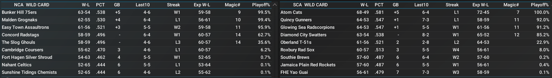 I still think Vault 81 is going to win it all. I think the league kept the win total down as right now the Railroad League looks like the strongest. Surprised to see the Rad Sox collapse but even with ten losses in a row they're still hanging on to a share of the last postseason spot |