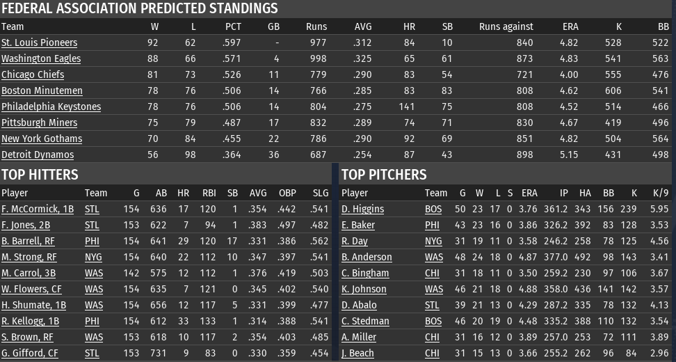 Seasonal Record: 18-21 (t-5th, 8 GB) Stars of the Week John Lawson : 24 AB, 12 H, 1 HR, 5 RBI, .500 AVG, 1.253 OPS Bill Ashbaugh : 14 AB, 7 H, 1 HR, 6 RBI, .500 AVG, 1.605 OPS Doc Love : 25 AB, 11 H, 0 HR, 7 RBI, .440 AVG, 1.003 OPS Weekly Schedule 5-18: Win at Cannons (8-7) 5-19: Win at Cannons (10-5) 5-20: Win at Kings (10-5) 5-21: Win at Kings (9-2) 5-23: Loss at Wolves (1-4) 5-24: Loss at Wolves (6-8) Summary I need to say every team is going to sweep us! We capped off a five game win streak with a sweep of the third place Kings. The current second place Wolves are about to sweep us in the finale to start the week, and they find themselves just two games out of first. We really should have won game two, but Tommy Wilcox was awful. We don't talk about bad starts, so we'll talk about his first big league save! On the 18th against the Cannons, he relieved Bill Kline after two shaky innings. Wilcox walked just one in a scoreless frame to earn the save in a tight 8-7 win. Bill Ashbaugh is not a superstar defender, but compared to to Ray Ford, he's at least above average. He also decided to rake, 7-for-14 with a double, two triples, a homer, 4 runs, a steal, and 6 RBI's. Pete Asher did fine too, but Ashbaugh will get a majority of the starts next week. John Lawson was excellent as well, going 12-for-24 with a double, homer, 5 walks, 5 runs, 5 RBI's, a steal, and zero strikeouts. Honestly, the entire offense was hot this week, and with less defensive pressure was 11-for-26 with 4 doubles, 3 RBI's, and 7 runs scored. Rich Langton finally got his first homer, and was 10-for-27 with 4 doubles, 6 RBI's, and 8 runs scored, but his hit streak was stopped at 20. Doc Love was 11-for-25 with a triple and 7 RBI's. Milt Frtiz was on against the Kings, 11 hits, 2 runs, 2 walks, and 3 strikeouts in a complete game win against another of his former teams. He's now tied for second in the CA with seven wins and has almost 40% of our team wins. Dick Lyons looked good in his one start, 6 innings with 7 hits, an earned run, a walk, and 3 strikeouts. He did allow four unearned runs, but we did still win his start 8-7. One of the errors was his, misplaying Dutch Leverett's bunt, but that only led to half of them. Dave Rankin started two games, winning the worse of the two starts and losing the better. He combined for 17 innings with 19 hits, 9 runs (7 earned), 7 walks, and 10 strikeouts. He now has a one strikeout lead over Barrell for the CA lead and a 0.3 WAR lead. Looking Ahead Our pretty successful road trip ends on the 25th, and we'll return home for four with the first place Foresters. They have the best record in the Continental Association just as they finished last year. Dean Astle sits atop the rotation, but 32-year-old Lyman Weigel has preformed really well. He's had a breakout season with a 1.96 ERA (243 ERA+), 1.13 WHIP, 21 walks, and 29 strikeouts in 64.1 innings shared between 6 starts and 5 relief appearances. We may miss him, but will likely get Lee Drouillard who's 4-0 with a 2.84 ERA (167 ERA+), 1.36 WHIP, 11 walks, and 7 strikeouts in 31.2 innings pitched. We're also set to face Ben Turner, who's had a rough start to his season. He's got a 9.61 ERA (50 ERA+), 2.14 WHIP, 9 walks, and 5 strikeouts in 19.2 innings pitched. Centerfielder Dan Fowler is off to an excellent start, slashing .329/.421/.651 (161 OPS+) with 41 RBI's and a league best 14 home runs. He's on pace for 55, and is unlikely to reach that, but Fowler has launched 22 or more homers in each of his first four seasons. Fred Quinn has a league best 18 steals and is slashing .357/.424/.435 (111 OPS+) with a homer and 17 RBI's. He's likely not going to keep up his 71 steal pace, but Quinn is easily one of the fastest players in the league. After Cleveland it's three in two days with the Sailors in what looks like it's going to be a tough homestand. We're off to start June, but the Sailors are tied in third with the Kings at 21-18 and they always field a competitive team. Dick Walker is killing it, slashing an insane .377/.464/.552 (150 OPS+) with 4 homers, 7 steals, and 28 RBI's in 179 trips to the plate. Lou Williams has found his groove, batting .386/.440/.462 (124 OPS+) with a homer, 12 steals, and 11 RBI's. Jack Cleaves is hitting an impressive .350/.424/.483 (124 OPS+) with 2 homers and 30 RBI's. Unfortunately John Kincaid has struggled, batting just .317/.364/.381 (85 OPS+) with 2 steals and 19 RBI's. Doc Newell has shined, 4-2 with a 2.17 ERA (219 ERA+), 1.20 WHIP, 16 walks, and 16 strikeouts in 54 innings pitched. Hal Carter is filling in at short and has done well, batting .356/.429/.493 (127 OPS+) with a homer, 10 RBI's, and 10 walks. Minor League Report 3B Hank Stratton (AA Mobile Commodores): It was an impressive week for Hank Stratton with the peak of a 5-for-6 performance over Birmingham. Currently ranked 84th in the league, Stratton is hitting .341/.365/.465 (119 OPS+) with a homer and 23 RBI's. I'm moving him over to first this week as I'm giving Billy Hunter some reps out at third. He profiles as a more then capable defender at third in the big leagues, this move is just to get more positional versatility for my youngsters. "Jitters" is young, just 21, and with John Lawson keeping the seat warm I can take my time and let him develop at his own pace. He spent all of last season in Lincoln, and may spend all of this season down in Mobile. I love his contact ability and he reminds me a lot of John Kincaid, just as a left handed hitter. I'm hoping Stratton will hit for more power, but a floor of John Kincaid is not bad at all. CF Oscar Panduro (C La Crosse Lions): After going 14-for-28 with 13 runs driven in, our 10th Round Pick was named UMVA Player of the Week. He's stuck down here in La Cross despite hitting .432/.491/.621 (168 OPS+) with a homer, 3 steals, and 24 RBI's in 108 trips to the plate. He's been playing left field, but I'm moving him over to center to give Billy Jordan Jr. more at bats in place of Izzy Sevi