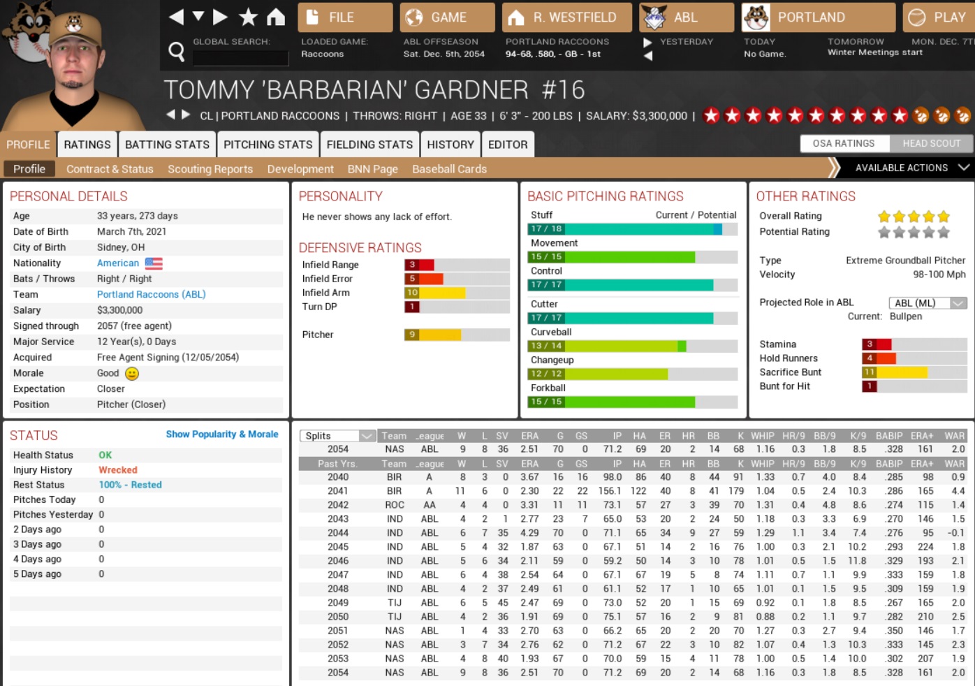 +++ November 21 – The Scorpions trade for the Warriors’ 2B/SS Ryan Harris (.266, 6 HR, 50 RBI), parting with MR Josh Penington (16-16, 4.73 ERA, 23 SV) and a prospect. November 24 – For a $350k signing bonus, the Raccoons add 22-yr old Cuban super utility Arturo Bribiesca to the organization. November 26 – The Loggers deal OF/3B Bryant Law (.240, 7 HR, 61 RBI) to the Capitals for 2B/SS/LF Miguel Cruz (.194, 0 HR, 1 RBI). [b]November 27 – The Raccoons acquire 29-yr old SP Kennedy Adkins (71-44, 2.92 ERA) from the Buffaloes in exchange for 28-yr old OF Matt Cox (.252, 98 HR, 402 RBI), 27-yr old Dave Blackshire (.238, 2 HR, 11 RBI), and 27-yr old AAA MR Jim Larson (3-5, 4.85 ERA). November 29 – Former Knights first-sacker Jay Rogers (.270, 78 HR, 343 RBI) hooks up with the Stars for a $18.56M contract over four years. November 29 – Ex-TOP LF/RF Nate Culp (.271, 222 HR, 717 RBI) signs a 3-yr, $10.32M contract with the Crusaders. November 30 – The Wolves send SP Zane Fenlon (22-23, 3.73 ERA) to the Capitals for #24 prospect SP Josh Scarbro. December 1 – 2B Tony Aparicio (.291, 277 HR, 1,452 RBI), who will be 41 in April, signs one more $6.6M contract with his most recent team, the Canadiens. December 1 – The Knights sign a pair of 36-year-old position players; former Buffalo 1B/LF/RF Eddie Moreno (.276, 401 HR, 1,429 RBI) agrees to a 2-yr, $10.6M deal, while ex-NYC 3B/2B Ronnie Thompson (.281, 12 HR, 717 RBI) will take in $1.04M for one year. December 1 – Ex-LAP C Eric Monaghan (.244, 102 HR, 470 RBI) winds up with the Thunder thanks to a 6-yr, $19.24M deal. December 1 – The Blue Sox trade right-handed swingman Rafael Mendoza (6-13, 4.65 ERA) to the Miners for a prospect. December 1 – Rule 5 Draft: 16 players are selected. The Raccoons lose MR Raul Medrano (0-1, 4.57 ERA) to the Wolves. December 2 – The Rebels bring ex-POR SP Arthur Pickett (156-104, 3.77 ERA) back to the FL East, signing the 36-year-old to a 3-yr, $6.3M deal. December 2 – The Knights acquire 1B Dale Haracz (.266, 41 HR, 218 RBI) from the Loggers, who receive INF Robby Gaxiola (.292, 4 HR, 31 RBI). December 5 – Portland adds a big-time closer in former Blue Sock Tommy Gardner (57-59, 2.53 ERA, 401 SV), who signs for three years and $9.9M. December 5 – The Bayhawks add left-handed ex-VAN SP Andy Overy (71-63, 3.84 ERA) for 4-yr, $15.84M. +++ Oh no. Not Medrano. How will I live. (causally keeps nomming chips with the use of his left hindpaw) The Buffaloes had a young team that was nevertheless not any good. They didn’t have a real way forward. It was unlikely that they were going to be good any time soon, which wouldn’t be helped by this trade either. Matt Cox had his worst season in recent memory in Portland, and while I was not actually trying to get rid of him, it was quite convenient that the Buffos were interested in him. The rest of the deal was finding the least painful combination of throw-ins – at times Matt Walters, Eloy Sencion or Matt Knight, as well as various AAA pitchers were part of the conversation as well as AA infielder Richard Anderson, who seemed thoroughly stuck where he was and like a weird request for the Buffos to have. Adkins was under contract for five more years and $24.52M. $3.32M in ’55, then $5.3M annually until 2059, which was a player option year. We sign Tommy Gardner for three years – or one for every Reliever of the Year award on his mantelpiece. The idea here is simple: Tommy Gardner ends games. It’s that easy. 11 straight years as a closer for three different teams, including five for the Indians, which we surely still remember. There is still money left over, but we have also yet to settle on the fifth starter (Brobeck or nah) and whether we make a splurge for another outfielder that might cost us our first-round pick after all… although the options were slim in that regard.