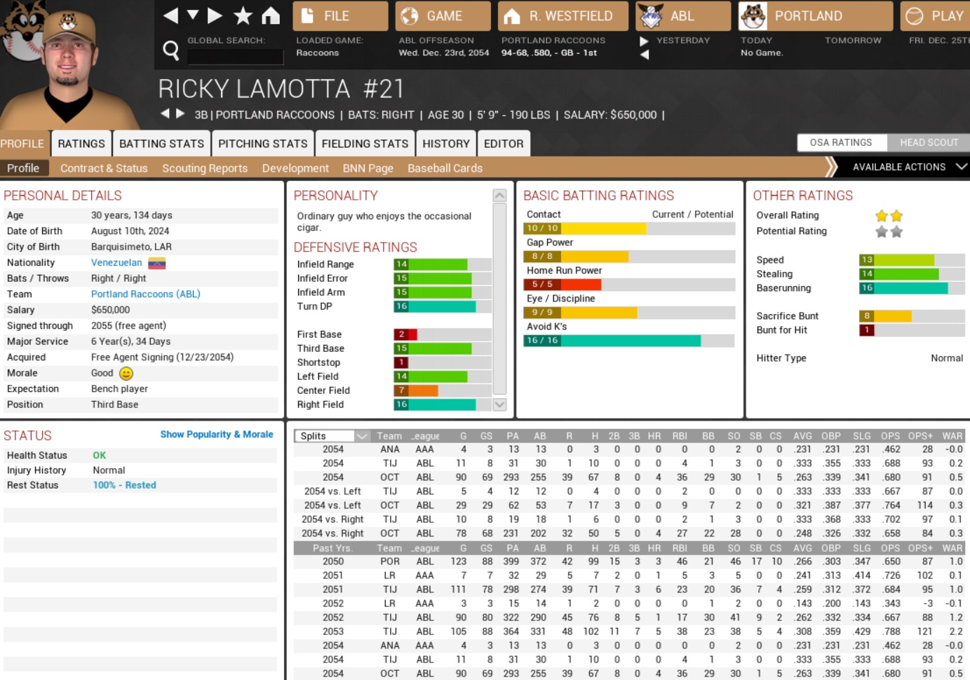 The problem was not dosh – the problem was that there were on high-profile outfielders available unless we wanted to go back to Ken Crum who’d surely stink defensively in a few years’ time. In any case we made an insurance signing in late December, bringing back Ricky Lamotta, who had spent most of 2050 with the Raccoons after getting claimed off waivers by the Loggers. He hadn’t hit much then, but he was still a valid defensive outfield and third base option. Lamotta had bounced around the CL quite a bit for a decade now, but 2050’s 399 PA with the Raccoons were still the most that he had ever gotten with anybody in a season. His old #12 was no longer available; he was assigned #21 instead and Naughty Joe, who was grimly robbed of the same number, was outrighted off the roster. All the while I kept sniffing around Charlotte’s Ethan Whitehead – also really a defensive centerfielder – but they were not impressed by the grab bag of failed relievers I was offering, and no deal came together. All other things failing, Pucks will keep starting in center, but then Lamotta or Tenazes can replace him in the late innings (or Pucks slots to a corner and Brassfield goes home. Around the holidays, I changed gears. Screw centerfield, we’d keep botching with Pucks and the right-handed soup of the day against southpaws. Let’s grab a corner outfielder. And not a right-hander, because I felt we had enough right-handed batters on the roster: only Waters, Crispin, and Pucks were non-right-handed batters projected to be on the Opening Day roster at this point (not counting thusly Rams and Raczka). Suddenly Ken Crum was an option again, but he had increased his price to 6-yr, $26.4M and while the dosh was technically there, we were now looking at a 38-year-old Ken Crum staggering around when his D trend was a concern even now. Interesting switch-hitting options were DEN Bill Ramires and SAC Jason Monson, but we didn’t have the prospects to swing for either one of them. Same for left-handed NYC Omar Sanchez. OCT Mike Harmon could *maybe* iced loose from them, but with him you were automatically buying 50 games on the DL, at least. He whacked 22 homers last season, in just 114 games. And then there was free agent Mike Allegood, longtime Falcon. He was 31, a very good defender in the outfield corners and third base, and passable in center in a way that Pucks was passable in center. Allegood had a few really good seasons in the past, but had batted .291 with 8 homers with the Falcons last year. When I went to the Thunder for Harmon, he immediately invoked his veteran 10/5 rights, so that was that. There was one more option. SFB Danny Munn was a lefty making $5.9M twice more (2056 was a player option, but let’s be real), and was a consistent 120 OPS+ stick. He had averaged 20 homers from 2049 through 2053 between the Warriors and Bayhawks, but had hit only 14 last year, making only 99 starts. His defense wasn’t much better than Ken Crum’s, but at least he wouldn’t linger until 36+ on our roster; he had just turned 31. His weight was an issue, so it would probably not get better in Portland, the world capital of easily accessible trash cans. +++ December 21 – 38-year-old ex-WAS 1B Manny Liberos (.245, 316 HR, 1,254 RBI) rejoins the Buffaloes on a $2.52M contract. December 22 – The Capitals console themselves with former Condors SP Larry Colwell (84-68, 3.45 ERA), who signs a 5-yr, $23.2M contract. December 23 – The Raccoons sign ex-TIJ/OCT OF/3B Ricky Lamotta (.273, 21 HR, 175 RBI) on a cheap $650k deal. December 25 – The Crusaders get pitching help by signing former Caps SP Kyle Turay (123-109, 3.43 ERA). The 31-year-old would make $33.6M over six years. December 25 – Former Buffos INF Mark Haney (.249, 27 HR, 270 RBI) gets signed by the Capitals on a 3-yr, $9.52M deal. December 28 – After two years in Vancouver, 35-yr old SP Jesse Bulas (101-95, 3.88 ERA) signs a 2-yr, $8.64M contract to be with the Capitals. December 28 – Portland signs ex-SFB CF Brent Cramer (.269, 60 HR, 326 RBI) on a $525k deal. December 29 – Nashville scoops up 39-yr old ex-OCT/WAS 3B/1B Ramon Sifuentes (.282, 218 HR, 1,133 RBI) on a $2.28M deal. December 30 – The Raccoons acquire 31-yr old LF/RF Danny Munn (.256, 145 HR, 543 RBI) from the Bayhawks for 25-yr old MR Antonio Alfaro (9-5, 4.09 ERA, 1 SV) and 26-yr old AAA MR Jason Mack. +++ On board is Danny Munn, and I hope I get plenty of occasion to call him Danny Fun! He will be the rightfield starter, with Brassfield, who was the weaker arm, in left, and Pucks in center. It’s not the greatest defensive outfield for sure, and if you’re a Ricky Lamotta on the roster, you should see quite a few late innings on the field, especially if the team is leading. Cramer would be 30 in January and in St. Pete in April. Even with a 120 OPS+ for his career, nobody wanted him near his major league team right now and we could try him out down there. But – ssshh! – he doesn’t know about the April part of the plan yet.