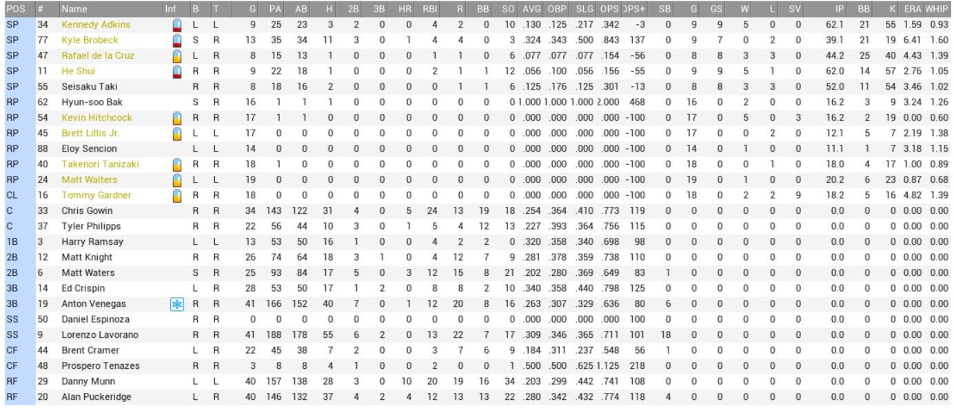 SP He Shui, 29, B:R, T:R (18-8, 2.48 ERA | 18-8, 2.48 ERA) – the Coons keep finding good pitching in Asia, with last year’s main import casually winning the Rookie and Pitcher of the Year awards, the ERA title, an All Star assignment, and the World Series. More of that, please. Has four pitches, a 94mph fastball, and very good control. He also does all of this silently while minding his own business. Seriously, I don’t remember him saying a word even once. Might be mute after all. SP Kennedy Adkins *, 30, B:L, T:L (16-12, 3.04 ERA | 71-44, 2.92 ERA) – if I want something, I get it – eventually, sometimes. The 30-year-old elite left-hander was on my wishlist for a decade, and I finally blackma- convinced the Buffos to let go of him. Good stuff, steady control, keeps it in the ballpark. Might win a Pitcher of the Year award one day. SP Seisaku Taki, 27, B:R, T:R (9-11, 3.48 ERA | 41-30, 3.01 ERA) – right-handed groundballer that was imported from Japan to some success, like, uh, winning both Rookie of the Year and Pitcher of the Year in his debut season (like He Shui!), PLUS a Gold Glove. Taki has three very good pitches, throws 95, and should continue to be a delight, even though last year showed him struggle for stretches. Everybody struggles at times, though? SP Rafael de la Cruz, 24, B:L, T:R (5-5, 3.98 ERA | 28-27, 3.60 ERA) – golden boy returned from his torn UCL in June… and struggled all the way to the end of the season. Sometimes he strikes people out, sometimes he walks them. He constantly seems to be in a 3-2 count, meaning his starts are short thanks to low-ish stamina, and he went only 110.2 innings in 19 starts in his return. Maybe I should have traded him for goodies at some point………. SP/3B Kyle Brobeck, 27, B:S, T:R (8-5, 3.59 ERA, 1 SV | 27-24, 4.27 ERA, 1 SV) – Brobeck is a weird, weird pitcher slash third baseman. In 2054 he got all of a World Series ring, a win, a save, a homer, and a stolen base while pitching in 38 and batting in 56 games. He hit .306/.388/.396 with the stick in 154 at-bats, the most he gobbled up in a season so far, and is a career .329 hitter. I guess we could do worse for a fifth starter / long relief candidate…? MR Takenori Tanizaki *, 27, B:R, T:R (no stats) – just keep buying Asian free agents! Tanizaki throws a splitter and a fastball for grounders, and has very good control on his resume. I will also never get his name straight, even if he were to pitch for this team for ten years. MR Matt Walters, 24, B:L, T:L (0-0, 1.85 ERA, 1 SV | 0-0, 1.85 ERA, 1 SV) – technically a failed starter (and former #8 pick), but while his arsenal is small, it still contains an unhittable curve and a 94mph heater; still working on control, but he could be a closer candidate in the not-too-distant future, but if he ever gets the changeup for a third pitch going, he’ll not have mercy with merely mortal batters anymore. SP/MR Hyun-soo Bak, 27, B:S, T:R (8-4, 2.49 ERA | 8-4, 2.49 ERA) – the second Asian import of 2054 came from Korea and has a fastball, slider, and splitter to offer. While he is an option for spot starting, he did not do so at all in his debut season, but gained the higher-ups’ confidence quickly and ended up in many close situations as evidenced by getting 12 decisions in relief. MR Eloy Sencion, 28, B:L, T:L (6-0, 3.11 ERA, 1 SV | 16-3, 3.29 ERA, 7 SV) – fastball, vicious slider, but if you were to look for this left-hander, who debuted in the majors in 2050, on the 2053 Opening Day roster rundown, you’d be out of luck. Nothing worked for Eloy Sencion in 2052, posting an 8.04 ERA in the majors after a flashy pair of seasons in 2050-51. He dropped as far as AA, and was not remotely near the big league portion of the depth chart as the 2053 began, starting out in AAA. When Brett Lillis jr. went down to injury early on, he was somewhat reluctantly recalled and somehow just worked again, making 52 appearances without major complaints. He put up nearly identical stats in 2054, and hasn’t lost a game in relief since that dismal 2052 season. SU Brett Lillis jr., 29, B:L, T:L (4-2, 2.81 ERA, 2 SV | 10-12, 3.40 ERA, 6 SV) – second-generation lefty reliever in the Coons pen – well, whenever he’s not injured. Very steady, also against right-handers, and might split eighth-inning duties with Hitchcock, or even get the odd save assignment against left-handed opposition. SU Kevin Hitchcock, 32, B:R, T:R (7-4, 2.86 ERA, 11 SV | 25-23, 3.05 ERA, 81 SV) – the German right-hander had to slot into the eighth inning role after the Raccoons added Daley in 2053, and it’s not gonna get any better for him with Daley gone, although he has largely pitched without complaints thanks to a 1.4 BB/9 mark in ’54 and generally allowing few home runs. Very good cutter/slider combo, generating groundball after groundball. One of only two Raccoons on the roster that still has 2040s rings with the team on his paw, for 2046 and 2047, although he only pitched seven games for the former team. CL Tommy Gardner *, 34, B:R, T:R (9-8, 2.51 ERA, 36 SV | 57-59, 2.53 ERA, 401 SV) – signed on a 3-year deal, Tommy Gardner is well known to Raccoons fans everywhere for closing games for the Indians for five years while we were winning those five straight penannts; four great pitches, but unfortunately no stamina, otherwise those three Reliever of the Year awards might have been Pitcher of the Year awards. C Chris Gowin, 28, B:R, T:R (.313, 19 HR, 75 RBI | .274, 41 HR, 260 RBI) – very fine defensive catcher the Falcons didn’t know what to do with and dumped onto the Raccoons for odd bits and pieces that didn’t fit anyway. Broke out in his second season in Portland, smashing almost as many homers as he had for his hole career previously, and whacked for an impressive 146 OPS+. No complaints, except that he’s in a contract year and might want a lot of dosh to keep doing this. C/1B Tyler Philipps, 28, B:R, T:R (.261, 2 HR, 18 RBI | .245, 4