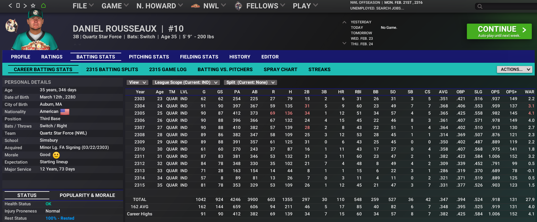 ---------------------------------------------------------- Nuka News Update Reporting on the NWL and APL by Evan Guy 21 February 2316 NWL Greats Last month we featured some of the speed demons of the NWL. With a bit less talent than what the CBO produces, small ball players are gems in the NWL. Now let's look at the overall best hitters, especially those powerful guys who tend to win MVPs. 1. Ah Oona, Grape, 2306-2315 - Oona joined the NWL after starting in the CBO as the 3rd-overall pick of Roxbury in the 2300 Rookie Draft. After playing just 29 games with the Rad Sox in 2305, his debut season, the Sox sent Oona to the Painted Ghouls. From there, Oona has become the NWL's all-time leader in HR (228). Oona is also the all-time leader in RBI (669) and WAR (29.93). 2. Daniel Rousseaux, Quartz, 2303-2315 - Rousseaux's longevity has been to the Star Force's benefit as one of the all-time great hitters with a lot of longevity. Rousseaux's longevity has also led him to be atop the leaderboard in career hits (1355), singles (918), and doubles (297). 3. Bumper Robinson, Grape (2302-2311), Orange (2311-2315) - Robinson is another player who has carved out a long career in the NWL. He has never been great enough to earn an MVP, but what he has done has been consistent in his 14 years. Robinson is the all-time leader in games played (1150), at-bats (4158), runs (775), total bases (2068), and walks (564).