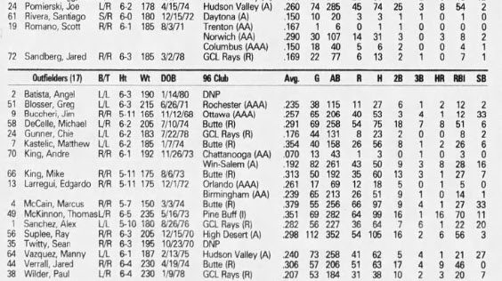 June 03, 1996 Before June Draft The Devil Rays held a Mini camp of 24 Players all Free Agents. Just curious if there is a Roster list of that Mini camp and any photos from Camp. Just curious of who was there and was cut before Minor league season started and if there was a roster list after June Draft. Thank You in advance and any response.