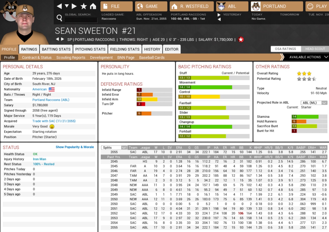 There. Have at it. +++ Raccoons (11-20) vs. Wolves (18-13) – May 9-11, 2056 The Wolves were something else. Sitting third in the FL West, four games behind the lead, they had given up the fewest runs in the Federal League, which wasn’t so absurd in itself, but they had also scored the fewest runs in the Federal League. They had scored fewer runs than the damn Critters, and they were scoring just a sliver over three runs per game, with a -14 run differential (Critters: -19). Something told me that they weren’t build to last, kinda like those condos in Florida where you just flip the walls back vertical after every storm that moves through. These teams had last played in ’53, with the better end for the Portland team, two games to one. Projected matchups: Sean Sweeton (1-2, 2.75 ERA) vs. Mike Pohlmann (1-3, 7.67 ERA) Craig Kniep (0-1, 1.42 ERA) vs. Jeff Puccia (0-1, 4.50 ERA) Rafael de la Cruz (0-3, 3.51 ERA) vs. Zach Stewart (4-0, 1.10 ERA) Southpaw in the final game on Thursday, unless they used the common off day on Monday to flip another lefty, Jeff Boyce (0-2, 4.72 ERA) into the series. How were they 18-13 with all those winless starters? Well, the pen was sucking up all the wins, somehow, with a 3-0 record and a zilch ERA on Coons castoff Raul Medrano f.e…. Game 1 SAL: C Carranza – 2B Humphries – 1B J. Campos – LF Hudson – 3B Wilken – RF Rock – CF Jo. Shaw – SS Keller – P Pohlmann POR: CF Royer – SS Lavorano – RF Puckeridge – 2B Waters – 3B Brobeck – LF Kirkwood – 1B Ramsay – C Fiore – P Sweeton One of the scoring-challenged Oregon teams burst out for four runs in the second inning, and it was your old Coons even! Chris Kirkwood socked a homer, his first since arrival, over the leftfield fence for the game’s first run, and Ramsay doubled to left. Fiore’s groundout made it two done, but Randy Wilken threw away Sweeton’s grounder to open a whole can of “uh-oh” and three unearned runs on the struggling starter three straight singles from the 1-2-3 batters following, with RBI’s for Lonzo and Pucks, before Waters flew out to center to end the inning. Joshua Shaw and Gabriel Keller would land hits off Sweeton in the third inning for a run, but the Raccoons put Brobeck and Ramsay on the corners in the bottom 3rd before the pitcher was at the plate with two outs yet again. This time, Pohlmann nicked him, filling the bases, then lost Royer to a walk in a full count, pushing home Brobeck to make it 5-1. Lonzo hit a sharp bouncer to third base, but right into Wilken’s paws, and that ended the inning. Ramsay drove in Waters and Kirkwood with a 2-out double to left-center in the fourth inning, ending Pohlmann’s day laden with seven runs (four earned) in under four innings. While lefty Ben Peterson ended the Raccoons’ scoring shenanigans in long relief, Sweeton would go seven innings of 1-run ball despite managing to put the leadoff man on base in EACH of his last five frames – the Wolves just couldn’t ******* score any more than the Raccoons without the benefit of a Randy Wilken error or a plunked pitcher with two outs. Right-hander Jose Soto gave up another two runs in the bottom 7th as Fiore singled, Royer was dinked, and Lonzo and Pucks got another pair of RBI’s with a single and groundout, respectively. Reynaldo Bravo finished out the game, offering a leadoff walk in the eighth and ninth innings, which made it seven straight innings the Wolves had the first batter on base. In the seventh attempt, they finally scored the bugger on a 2-out pinch-hit single by Scott King. And that was the ballgame. 9-2 Raccoons. Royer 2-3, BB, RBI; Lavorano 2-5, 2 RBI; Waters 2-5, 2B; Kirkwood 3-5, HR, RBI; Ramsay 4-5, 2 2B, 2 RBI; Sweeton 7.0 IP, 6 H, 1 R, 1 ER, 3 BB, 8 K, W (2-2); Pitching change for Wednesday – the Wolves brought Blake Sparks back from a rehab assignment to start the middle game of the series. The right-hander had logged one out in his first start of the year before leaving the game with a shoulder strain. Sparks, 28, was the 2052 FL ERA champ and had put up a 2.76 ERA in ’55. Game 2 SAL: C Carranza – RF Rock – CF T. Lopez – 3B Wilken – LF Hudson – 1B S. King – SS Thatcher – 2B Keller – P Sparks POR: CF Royer – SS Lavorano – RF Puckeridge – 2B Waters – 1B Ramsay – LF Caballero – 3B Venegas – C Fiore – P Kniep The Wolves’ leadoff-man-on-base streak extended to eight when Fernando Carranza drew a walk to begin Wednesday’s game, but was left on just like 86% of the others in the string. Andy Hudson went down to begin the second inning. Kniep walked a guy in each of the first three innings, but didn’t allow a hit or run, then bunted Venegas and Fiore into scoring position in his first turn in the box in the bottom 3rd; those two runners were the first to reach base for Portland, and had knocked the first two singles in the game. Royer’s sac fly to left and Lonzo’s single to center brought in the runners, 2-0, and while Lonzo was stranded on Pucks’ groundout, Matt Waters jumped a leadoff jack to right in the fourth, 3-0. Craig Kniep maintained a no-hitter through five innings, as well as a manageable pitch count, but all that went out the window in the sixth. Firstly, Tom Rock hit a single. Secondly, Carranza and Tony Lopez drew walks on either end of that single. Thirdly, there was nobody out. A pep talk seemed to have no great effect at first, as Randy Wilken kept the line moving with an RBI single to center, and Andy Hudson’s groundout brought in a second run to narrow the lead to a skinny run, but then Kniep got pops from King and John Thatcher to strand a pair in scoring position. Not *great*, but could have been worse. I was still marking that as a “didn’t suck”. Kniep added another inning, then was hit for with Adriano Chavez, who hit a single, but was also left on first base by the Coons. Lane and Lillis put the eighth together for Portland, nursing the 3-2 lead, while 
