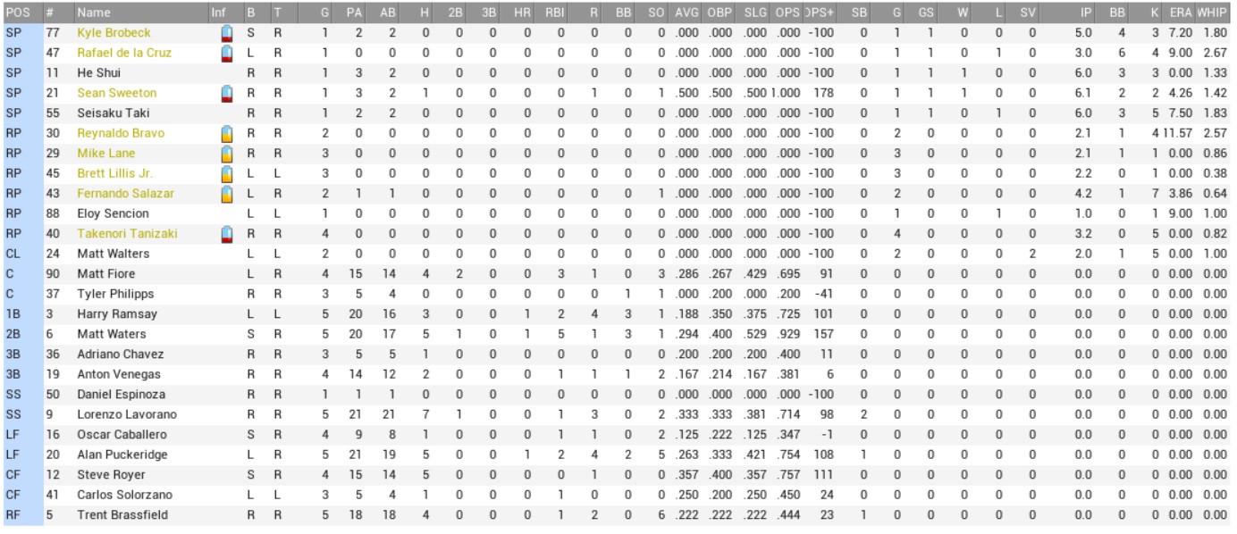 Just a 2-game set to get warmed up for the season, and then immediately an off day afterwards, which almost felt like a waste of a precious off day. These two teams had split the season series right down the middle last year, and both teams pretended they had chances this time around, not only for the season series, but also for the division. Projected matchups: He Shui (0-0) vs. Ben Seiter (0-0) Seisaku Taki (0-0) vs. Kyle Turay (0-0) No left-handed pitcher in sight here. Game 1 NYC: 2B O. Sanchez – SS Z. Suggs – 1B Sevilla – 3B Gates – LF M. Villa – RF C. Williams – CF Pfeifer – C Seidman – P Seiter POR: RF Brassfield – SS Lavorano – LF Puckeridge – 1B Ramsay – C Fiore – 3B Venegas – 2B Waters – CF Royer – P Shui He Shui retired the side in order in the first inning, although every Crusaders batter only disappeared after running a full count, while the Raccoons’ top three in the lineup all reached base. Brassfield and Lonzo singled to left, and Pucks drew a walk from the 25-year-old righty Seiter, who had yet to get calibrated for the zone. The Raccoons, though, were already in midseason form: with three on and nobody out, Ramsay popped out, Matt Fiore lined out to Omar Sanchez, and Anton Venegas whiffed, leaving each and every runner on base stranded. And I opened the first bottle of Capt’n Coma of the new season… Seiter would get the first Crusaders hit of the year with a third-inning single, but nothing came of that as both teams attempted to fill the scoreboard with goose eggs. Steve Royer was the only Coon to reach base in both of his first two plate appearances of the season, hitting a pair of singles in the second and fourth innings. Shui bunted him over once, but then batted with two gone in the fourth inning and grounded to Prince Gates, who fumbled the ball for an error, bringing Brassfield up with two on and two outs, but he miserably popped out to shortstop Zach Suggs on the first pitch, which sugged. The parade of zeroes lasted until the fifth inning when Pucks reached on a throwing error by Sanchez. The Crusaders progressively walked Ramsay with intent, but then got burned on Matt Fiore’s double to right, which brought in the team’s first run of the season, unearned as it was. Venegas added a sac fly for a 2-0 lead before the inning drizzled away. Speaking of drizzle… (looks skywards) Shui went six scoreless, but the many, many 3-ball counts ran up his pitch count. Chad Williams then hit a leadoff single in the seventh, and he walked Mike Pfeifer before getting lifted with the tying runs on base. The Coons took the protective foil off the pen, and brought in Tanizaki and Lillis to retire the next three batters in order without allowing Williams to get as far as third base. Mike Lane had a scoreless eighth inning in his Raccoons debut, while the offense failed to tack on anything against Seiter, who went eight innings. Matt Walters then got into the ninth inning in his first outing as designated closer. Williams snuck a leadoff single to right on a 1-2 pitch, while PH Erik Stevens grounded out. Walters then cranked it up a bit – both Mike Seidman and PH Jose Ortiz struck out. 2-0 Raccoons. Ramsay 2-3, BB; Royer 2-4; Game 2 NYC: 2B O. Sanchez – SS Z. Suggs – 1B Sevilla – 3B Gates – LF M. Villa – RF C. Williams – CF Pfeifer – C Seidman – P Turay POR: RF Brassfield – SS Lavorano – LF Puckeridge – 1B Ramsay – C Fiore – 3B Venegas – 2B Waters – CF Royer – P Taki For the second day in a row, the Raccoons pitcher batted with two outs and a body or two on base, and reached on an error, this time by Zach Suggs. This filled the sacks in the bottom 2nd in addition to Waters and Royer, who were already on base. Trent Brassfield hit a ball to deep right, but beat neither Williams nor the fence, and the inning ended. The Coons would take the lead an inning later, though, with Pucks opening the home run race for the team with a solo shot to right, putting Taki up 1-0. The run didn’t last, thanks to Williams’ double to left and Mike Pfeifer’s single to center in the fourth inning, which tied the game back up real soon, and Zach Suggs going deep to right-center gave New York the lead in the fifth inning, 2-1. The Raccoons failed to react appropriately, and Taki continued to melt, with Williams and Pfeifer on base again in the sixth inning before Seidman walloped a 3-run homer to center, merely 435 feet before cratering. Taki finished the inning, but left being well-beaten afterwards. The Coons had only four hits at that point, although Matt Waters doubled home Ramsay, who drew a leadoff walk in the bottom 6th, shortening the score to 5-2. Reynaldo Bravo then showed up, faced four batters, and gave up four screamers for hits. Raul Sevilla was thrown out at third base trying to further extend a leadoff double against Brassfield, but then Prince Gates rapped a single, and Mario Villa and Chad Williams slapped doubles for two more runs. Fernando Salazar replaced him, but surrendered the third run of the inning on a Seidman single with two outs. The Crusaders would just keep raking against him – Sevilla banged a 2-run homer in the eighth off Salazar, and at that point it was just getting over with that game. Pucks singled off Ken Quisenberry to start off the bottom 8th, then stole second, the first theft for the team on the season. Matt Fiore drove him home, taking the team RBI lead with a lofty two, where he was then joined by Matt Waters after both him and Venegas hit more singles off Quisenberry. Carlos Solorzano batted for Salazar in the #8 spot, hit a sac fly to scrub the score down to 10-5, but Caballero then lined out to left. Good judgment then did not prevail when the rain started in earnest in the ninth inning and the umps made everybody sit through an hourlong rain delay in a 5-run game. Brassfield singled off Ben Lussier when play resumed, then was forced out by Lonzo, who stole second base, though