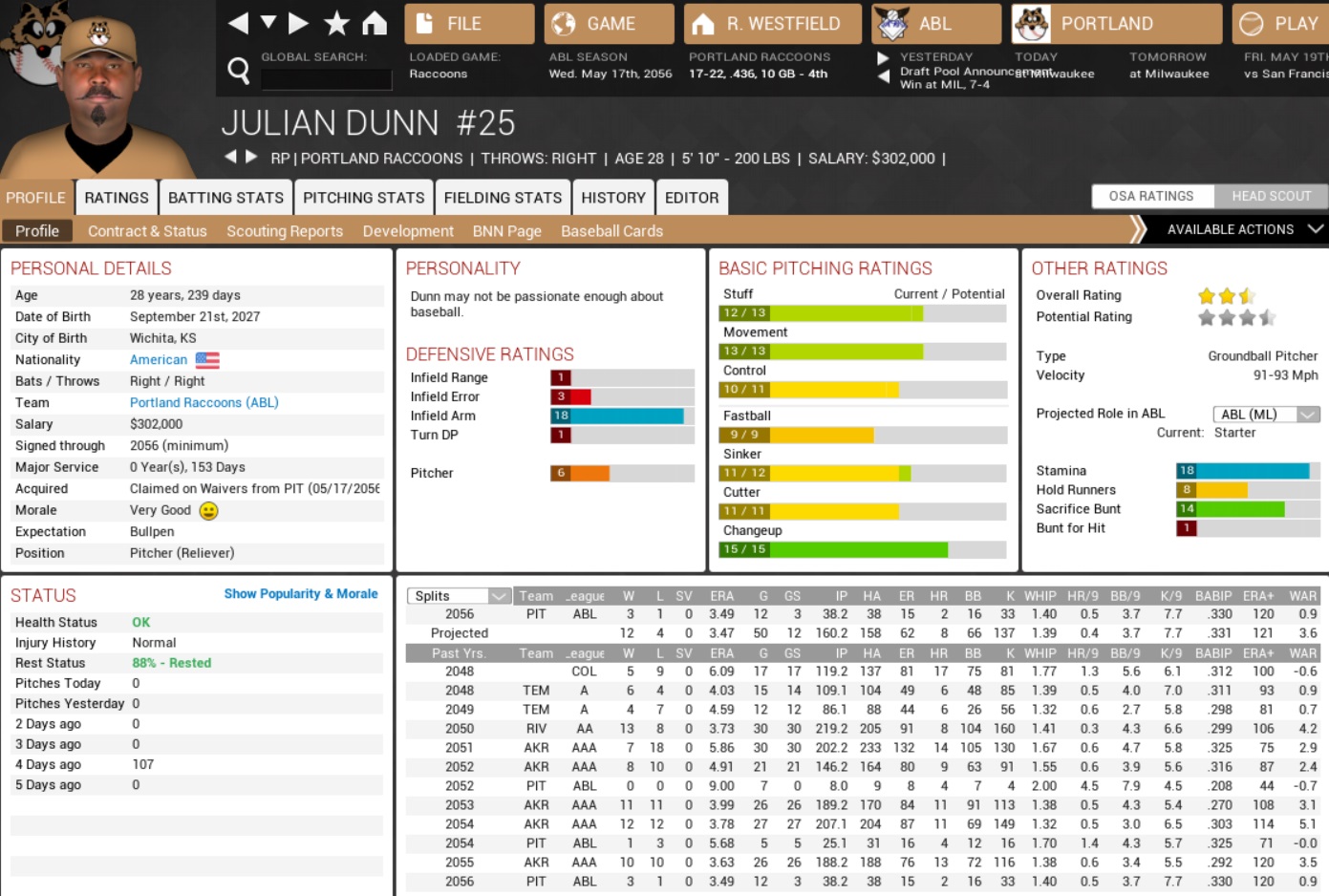 Here was another team that we had ended up going 9-9 against last season, which was a lot of 9-9 (three teams total) to go in your division and still win it by 12 games. The Loggers were eighth in both runs scored and runs allowed, with a completely inept bullpen pushing an ERA near six, but which one had to get to in the first place. They were near the bottom in homers, but first in stolen bases. Projected matchups: Craig Kniep (1-1, 2.02 ERA) vs. Jamie Kempf (2-1, 4.82 ERA) Rafael de la Cruz (0-3, 3.94 ERA) vs. Roberto Alvarado (2-2, 4.73 ERA) He Shui (3-3, 4.53 ERA) vs. Victor Scott (1-4, 5.16 ERA) Seisaku Taki (3-5, 4.74 ERA) vs. Tyler Riddle (4-0, 1.95 ERA) Two from the right, two from the left, and most of them should give way to the bullpen eventually… but these were the Coons, still scoring under four runs per game. Game 1 POR: CF Royer – SS Lavorano – 2B Waters – LF Kirkwood – 1B Ramsay – RF Puckeridge – 3B Venegas – C Fiore – P Kniep MIL: CF B. Rivera – 3B Gaxiola – LF Pigman – 1B D. Robles – RF Callaia – SS E. Miller – C M. Torres – 2B T. Edwards – P Kempf Kniep held out for two innings, then was slaughtered. Travis Edwards bashed a leadoff double, scored on Bobby Rivera’s single, who scored on another screaming double mashed by Robby Gaxiola, who was TRIPLED home by Perry Pigman, who finally scored on Dave Robles’ groundout. They also stole a few bases in between there while casually dumping four runs on Kniep. The Raccoons had yet to produce much, but would get Venegas and Fiore on base with one down in the fifth, which was still better than never. Kniep bunted them into scoring position, and Venegas scored when Royer… had his grounder to first base butchered by Robles for an error. Lonzo then popped out in foul ground when he was the tying run, and that ended the inning. It took another error by Kempf to get the team at least visually going in the seventh inning. Fiore had drawn a 1-out walk, and this time Kniep’s bunt was fumbled by the opposing pitcher, bringing the tying run back to the plate. Royer rumbled into a double play, 1-6-3, to kill that unearned chance. The Loggers **** two more runs on Kniep in the bottom 7th with a single by Kempf and then Rivera’s triple, the latter run being brought in a Gaxiola grounder. 6-1 Loggers. Fiore 1-2, BB; Game 2 POR: CF Royer – SS Lavorano – 2B Waters – RF Puckeridge – LF Caballero – 1B Ramsay – 3B Chavez – C Fiore – P de la Cruz MIL: CF B. Rivera – SS Gaxiola – LF Pigman – 1B D. Robles – RF Callaia – 3B Burgos – C C. Thomas – 2B E. Miller – P Alvarado Lonzo got on in the first, but was forced out by Waters. Pucks’ double and Caballero’s single each drove in the runner ahead of them for a lofty 2-0 lead, which doubled to 4-0 in the second inning as Fiore reached base again with a single, and then Royer took Alvarado quite deep to right. Lonzo nearly hit another bomb to left, but that one was picked at the fence by Perry Pigman. The inning ended with Waters, but Pucks and Caballero were on base again in the third inning, and Adriano Chavez brought at least one run home with a groundout, 5-0. A sixth Portland run scored in the fifth inning, which Caballero opened with a triple to center, then scored on a wild pitch. And Raffy? Six shutout innings, but I covered my eyes with my paws the entire time. Four hits, three walks, two strikeouts, 88 pitches and gassed – also a few deep drives to right that kept Pucks busy especially in the last few frames he pitched. The Loggers only started to score in the bottom 7th when Tanizaki walked Ryan Bishton, who stole second base, and then jogged home when Ramsay chucked Rivera’s 2-out grounder into the stands rather than into Tanizaki’s mitten. When Lillis replaced Tanizaki, he threw a wild pitch, walked Robby Gaxiola, and only then was kind enough to strike out Pigman for the third out, in a full count. It only got worse for him in the eighth, when left-handers Gaudencio Callaia and Chris Thomas hit soft singles, and then right-hander Eric Miller smashed a not-so-soft homer off Lillis. That narrowed the score all the way to 6-4, but Mike Lane got out of the damn inning, and then Lonzo rushed a leadoff triple in the ninth against Josh Costello. Waters’ sac fly added on a run again, but Matt Walters just didn’t needed it. After two horror innings, he retired the Loggers in order to put the game away and even the series. 7-4 Coons. Lavorano 3-5, 3B; Puckeridge 2-5, 2B, RBI; Caballero 3-4, BB, 3B, RBI; de la Cruz 6.0 IP, 4 H, 0 R, 3 BB, 2 K, W (1-3); Now imagine Raffy could still throw 100 pitches, or not go to ten 3-ball counts in a game… but I guess he hurled himself to yet another start, somehow? I mean, you can’t bin him after six shutout inning and a W, can you? Interlude: waiver claim The Raccoons claimed 28-year-old right-hander Julian Dunn (3-1, 3.49 ERA) off the Miners on Wednesday. He was a swingman with four pitches, but a poor fastball, and despite being only a few months short of his 29th birthday had only 72 innings in total in the majors. But the Raccoons were kinda desperate, so there was that. Dunn had thrown 107 pitches on Saturday and was thus not assigned to the roster on Wednesday yet. Raccoons (16-21) @ Loggers (15-20) – May 15-18, 2056 Game 3 POR: CF Royer – SS Lavorano – 2B Waters – LF Kirkwood – RF Caballero – 3B Venegas – 1B Ramsay – C Stanton – P Shui MIL: CF B. Rivera – SS Gaxiola – LF Pigman – 1B D. Robles – RF Callaia – 3B Burgos – C C. Thomas – 2B T. Edwards – P V. Scott Lonzo forced out Royer in the top 1st, but stole second base to get a body into scoring position. Waters walked, and Chris Kirkwood and Oscar Caballero both clipped RBI singles before Venegas also got on to fill the sacks. Ramsay and Stanton struck out to keep the sacks filled for the inning. The Loggers shrugged, socked four hits off Shui, and tied the game right in the bott