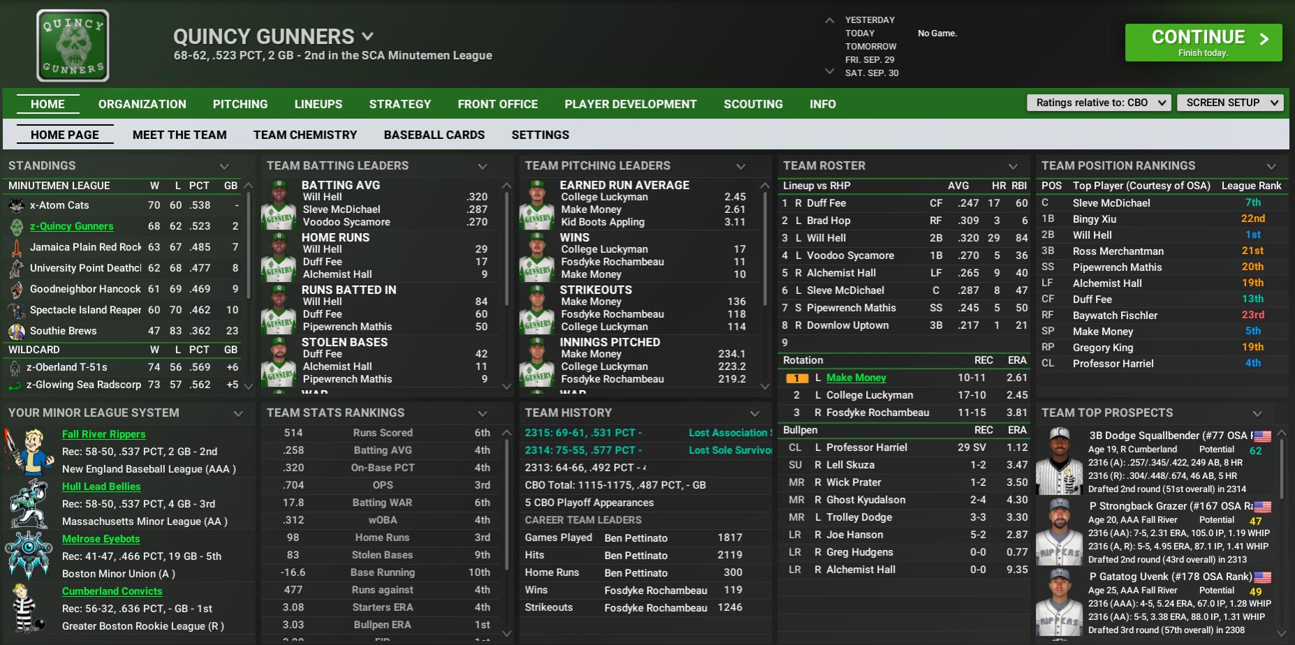 BNN Report News from the CBO, Minors, CCBL, CYL, and CBA by Nat Wright-Kawolski 3 October 2316 Sole Survivor Series 2316: Easy Town Assaultrons vs Quincy Guinners Game Results Game 1: Quincy 5, Easy Town 2 Road Win Lifts Quincy to 1-0 Lead in SSS The Quincy Gunners powered past the hometown Easy Town Assaultrons, 5-2, in the opener of the Sole Survivor Series at Easy Town Field. Quincy starting pitcher Make Money threw 8.0 innings of 4-hit ball, to lead the charge. The Gunners now lead the series 1-0. Money, a native of Watertown, Massachusetts, was dealing all game. He kept Easy Town hitters off-balance, while giving the Gunners 8 quality innings. Money threw 107 pitches, allowing 4 hits and striking out 6. "We'll take some time to unwind," said Money, "and then get after it again." The next game is set to be played tomorrow at Easy Town Field in Easy Town. Game 2: Quincy 5, Easy Town 1 Quincy Pins 5-1 Loss on Easy Town Leave it to the veteran. The Quincy Gunners got a great start from 35-year-old left-hander College Luckyman, as Quincy won the contest, 5-1, at Easy Town Field. Luckyman threw 8.0 innings of 4-hit ball in the win, which allowed the Gunners to grab a 2-0 lead in the best-of-7 series. The Assaultrons had trouble solving Luckyman, who surrendered 1 run on 4 hits over 8 innings. "I was able to change speeds effectively tonight," said Luckyman. Game 3 is scheduled for Sunday at The Stone House in Quincy. Game 3: Quincy 5, Easy Town 4 Gunners Clip Assaultrons, 5-4, in SSS Contest A sweep is in sight. The Quincy Gunners overcame a spirited performance by Easy Town center fielder Eden Babz to knock off the Assaultrons, 5-4, at The Stone House in Game 3 of the Sole Survivor Series. Babz went 2 for 4 with a home run, while adding 4 RBI and scoring once but could not will the Assaultrons to victory. Quincy now sits on a 3-0 advantage and has its eyes on sweeping the best-of-7 series. Downlow Uptown went 1 for 2 for Quincy. With one out and the game tied in the bottom of the sixth inning, Uptown had a clutch at-bat. Facing Easy Town hurler Lonely Gale, he hit a sacrifice fly to give the Gunners a 5-4 lead. "We're going to have to play flawless baseball from here on out," Easy Town manager Malik Christmasstory said. "Which, let's face it, we haven't been doing lately." The next game is set to be played tomorrow at The Stone House in Quincy. Game 4: Quincy 3, Easy Town 1 Gunners Sweep Assaultrons The Quincy Gunners earned their 1st Sole Survivor Series title and now have all winter to spend basking in the glory, while the beaten Easy Town Assaultrons will have plenty of time to wonder what went wrong. Quincy became the Commonwealth Baseball Organization champion for 2316 with a 3-1 triumph to capture the series 4-0. Starter Make Money was the Game MVP, allowing just two hits and one earned run with three walks and three strikeouts in 7.0 innings. He finished 2-0 with a 1.20 ERA in two starts, outdueling the Trons' Tarzan Rogers each time. "Both clubs are talented. We just made fewer mistakes than they did," winning manager Scrappy Barios said to the press corps at the postgame press conference. "We made the crucial plays and got the timely hits." Easy Town skipper Malik Christmasstory agreed with that assessment, saying his club turned out to be "a little weak on fundamentals" at crucial times. "I have a sneaking suspicion we will be working on fundamentals a lot next spring," he said. In the Assaultrons' two appearances in the Sole Survivor Series, they are now a combined 0-8. Despite Money's efforts in two starts, 1B Bingy Xiu was named the Series MVP. Xiu was 7 of 14 (.500) with a double, a home run, a walk, four runs, and two RBI in four starts as cleanup hitter. On the way to the Sole Survivor Series championship, the Gunners ended up in second place in the South Charles Association Minutemen League and compiled a 68-62 record during the regular season. They were the 6th seed in the SCA. Sole Survivor Series CBO Playoff Tree Quincy Team