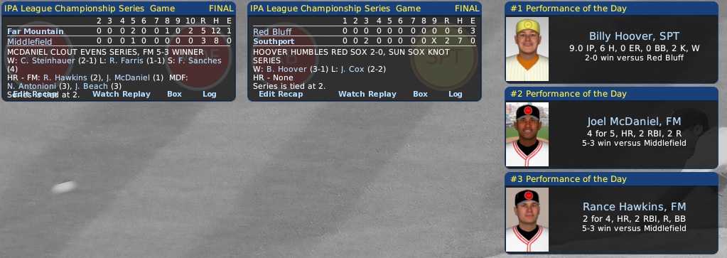 Monday, September 30, 2047 2047 IPA LEAGUE CHAMPIONSHIP SERIES - GAME 4 Ruthlandian Union MCDANIEL CLOUT EVENS SERIES, FM 5-3 WINNER In game four in Middlefield, Far Mountain copped its second straight victory in the Ruthlandian LCS to even it up at two games each in the best-of-seven series... the Redhawks rallied in the late innings to force overtime... Joel McDaniel crashed a two-run homer to defeat the Roosters 5-3 in 10 innings... starter Curt Steinhauer (2-1/2.56) hurled nine innings for the victory with relief help from Fernando Sanches (0-2/3.52), who got his fourth save in the playoffs by holding Middlefield scoreless in the last of the 10th... the third Rooster pitcher Ricky Farris (1-1/3.65) not only blew the save, but lost the game... he was slammed for three runs and five hits in three innings. The Redhawks collected 12 hits and were sparked by C Joel McDaniel (.379) with 4-for-5, two runs and two RBIs... 2B Rance Hawkins (.220) also drove in two runs and registered a pair of hits... McDaniel and Hawkins both went deep... the Roosters had eight hits with roundtrippers by CF Norman Antonioni (.209) and SS Jimmy Beach (.308)... Antonioni hit a two-run salvo and Beach a solo shot. Tycobbian Union HOOVER HUMBLES RED SOX 2-0, SUN SOX KNOT SERIES Under beautiful sunny skies at Pleasure Beach Park in Southport, Billy Hoover humbled the Red Bluff Red Sox 2-0 on a six-hit shutout to knot the Tycobbian LCS at two games apiece... Hoover (3-1/2.60) was in command, fanning two batters and walking none... he outpitched Jud Cox (2-2/1.11), who had beaten him in game one 5-1... Cox worked seven frames, yielding two runs on six hits. Shoddy defense by the Red Sox gave the Sun Sox all the runs they needed in the third inning... none of the runs Cox gave up were earned... two throwing errors by right fielder David Kelso (.417) proved costly... CF Barney Lewis (.242) and C Visalis Vlachos (.244) drove in the Southport scores... the Sun Sox had 7 hits to 6 for the losers. Last edited by Eugene Church; 07-31-2014 at 11:27 AM. |