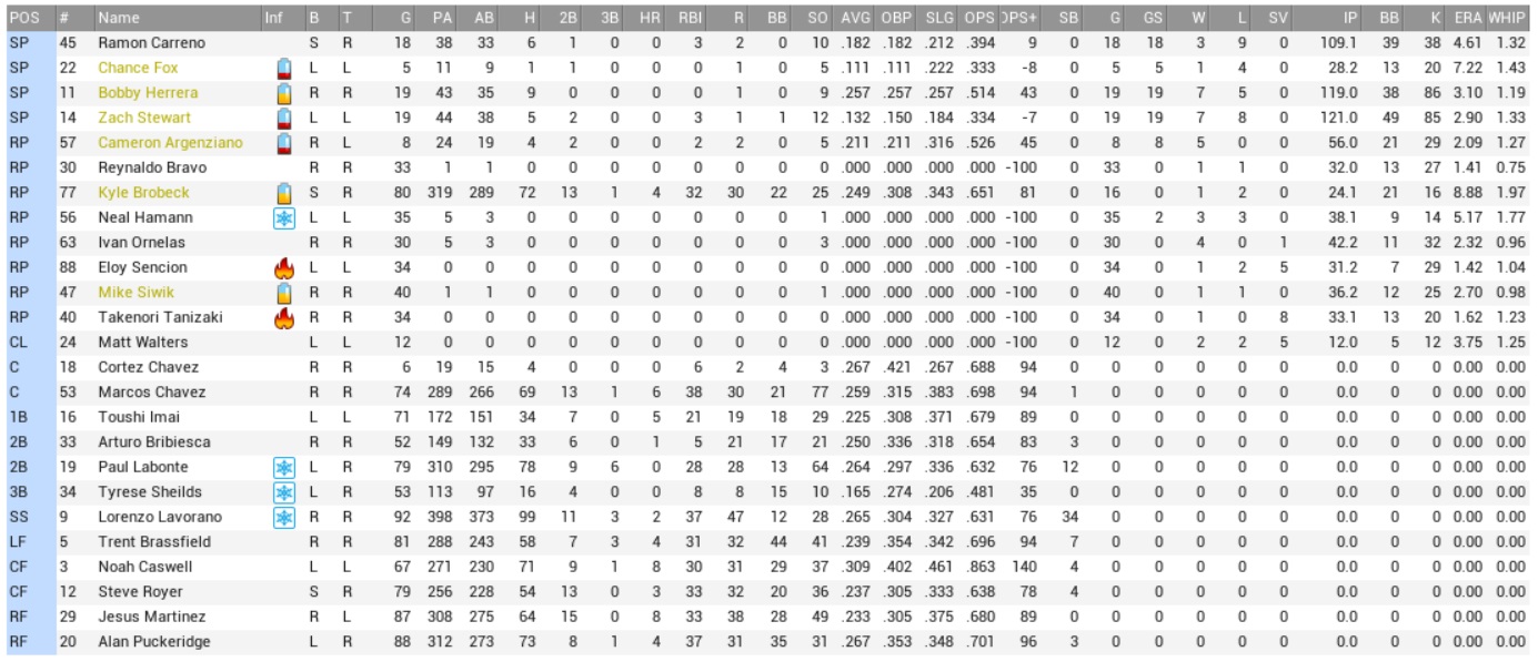 The Raccoons were to play four games with the Indians, who they had already played four games against, splitting the whole affair two and two. Indy was bottoms in runs scored and seventh in runs allowed in the Continental League, lugging around a -40 run differential that looked a lot like it was gonna get bigger. Maybe not this week, though. Projected matchups: Ramon Carreno (3-5, 3.82 ERA) vs. Bill Lawrence (3-6, 4.15 ERA) Ryan Wade (0-1, 48.60 ERA) vs. Jeremy Fetta (2-3, 3.47 ERA) Bobby Herrera (4-3, 3.60 ERA) vs. Shane Fitzgibbon (6-5, 4.50 ERA) Zach Stewart (4-5, 2.78 ERA) vs. Josh Barbieri (2-6, 5.02 ERA) Fitzgibbon was the only southpaw to come up against the Critters in this series. The Coons had been rained out on Sunday. We kept Carreno on regular rest on Monday, then moved Ryan Wade to Tuesday. Herrera and Stewart had both pitched on Saturday, so neither would be on regular rest to start on Wednesday. We might figure out something, use Brobeck, call someone up from AAA, or maybe meet somebody in the hotel lobby, a travelling insurance salesman that wanted to give pitching a go his whole life. Couldn’t be much worse than Wade. Noah Caswell had been activated for the opener, and Matt Walters was still rehabbing in St. Pete, but was due to rejoin the team this week as well. He had so far pitched three times, and I wanted him to go out at least four times, maybe five. Game 1 POR: 2B Labonte – SS Lavorano – CF Caswell – C Chavez – 3B Brobeck – LF Puckeridge – 1B Royer – RF Martinez – P Carreno IND: 2B Kilday – 3B An. Rios – 1B B. Quinteros – LF O. Ramos – RF Lovins – SS R. Vargas – CF Abel – C Lefebvre – P B. Lawrence Bill Lawrence retired 15 of 16 Raccoons he faced in the first five innings, only seeing Brobeck reach on an error in the second inning, and that was it for the Raccoons early on, while the Indians didn’t get *much*, but they got Carreno for a homer to left by Antonio Rios in the third inning, and Quinteros lashed a 2-out, 2-run double with Matt Kilday and Rios on the corners in the fifth inning for a 3-0 lead for the home team. The Raccoons loaded the bases in the top 6th through precious little talent of their own. Jesus Martinez slapped a leadoff single, and Carreno failed to bunt, poking for a duck snort single at 0-2 instead. Labonte tried the old 6-4-3 vanishing trick with a grounder to Ricardo Vargas, but Vargas bobbled the ball and the Coons instead had the tying runs all on with nobody out. Lonzo’s slow grounder to third base allowed a run to score while he was thrown out at first base by Rios, but Noah Caswell made all the doctor bills worthwhile with a game-tying single over the head of Vargas. The inning fizzled out after that, while Pucks and Martinez drew walks in the seventh inning against Lawrence, but Carreno bunted into an inning-ending double play, then continued his bid for an L when he allowed Kilday on base with a 2-out single in the bottom 7th. Kilday stole second, Rios socked an RBI double, and Quinteros would single home another run off Ricky Herrera when the Coons were finally full of Carreno’s act. Lawrence went eight, and Randy Slocum held up the lead for the Indians in the ninth despite a leadoff double by Marcos Chavez, who was stranded on second base. 5-3 Indians. Martinez 1-2, BB; Matt Walters came back on Tuesday after throwing 17 pitches on Monday. Alex Rios (0.00 ERA) was returned to St. Petersburg. Game 2 POR: 2B Labonte – SS Lavorano – CF Caswell – C Chavez – 3B Brobeck – RF Puckeridge – 1B Royer – LF Brassfield – P R. Wade IND: 2B Kilday – 3B An. Rios – 1B B. Quinteros – LF O. Ramos – RF Lovins – SS R. Vargas – CF S. Thompson – C Lefebvre – P Fetta Thankfully there was never a concern that Matt Walters might pitch on Tuesday. Ryan Wade briefly fooled me by starting the game with two outs, then walked Quinteros, nailed Orlando Ramos with an 0-2 pitch, threw a wild pitch, allowed a single to Chris Lovins, walked Vargas, and then Steve Thompson singled, another wild pitch, Michael Lefebvre doubled, ANOTHER WILD PITCH, and then a K to Jeremy Fetta finally ended the 5-run inning. Wade ****** another run on the board in the second, then walked the bags full in the bottom 3rd before hitting Fetta with another ****** pitch. He was yanked for Hamann, and was on waivers before the game was over. Hamann was also no more helpful than a wet rag, allowing RBI singles to Kilday and Rios, and another run to score on Quinteros’ double play grounder. 10-0 at that point, by the way. The game was essentially over, and it wasn’t like the Raccoons did any rallying. They scored a run in the fifth inning, getting on base Royer and Brass to begin the inning, but only scored on Fetta’s wild pitch. Yay. Ornelas allowed a run to Indy in the seventh that didn’t really matter in the grand scheme of things. 11-1 Indians. Sheilds 1-1; Ryan Wade (0-2, 46.64 ERA) was surely never going to be seen again around here. The vacated roster spot was used for Cameron Argenziano to make a spot start on Wednesday. The 30-year-old left-hander was 2-7 with a 4.20 ERA with the Alley Cats, and across an inexplicably long time of ferrying back and forth between Portland and St. Pete had accumulated a 10-12 record with 3.95 ERA in Portland. Game 3 POR: 2B Bribiesca – SS Lavorano – C Chavez – CF Caswell – 3B Brobeck – 1B Royer – RF Martinez – LF Brassfield – P Argenziano IND: SS Kilday – CF Oldfield – 1B B. Quinteros – LF Abel – RF O. Ramos – C Lefebvre – 3B R. Vargas – 2B Bahena – P Fitzgibbon I was begging the baseball gods for five innings from Argenziano and being vaguely in contention after that, but the Raccoons were actually up 2-0 after five innings, having scored their runs in the top 3rd, which began with … an Argenziano double. Lonzo doubled home the pitcher, and Caswell singled home Lonzo for the runs, while Argenziano was not flashy, but serviceable on the 