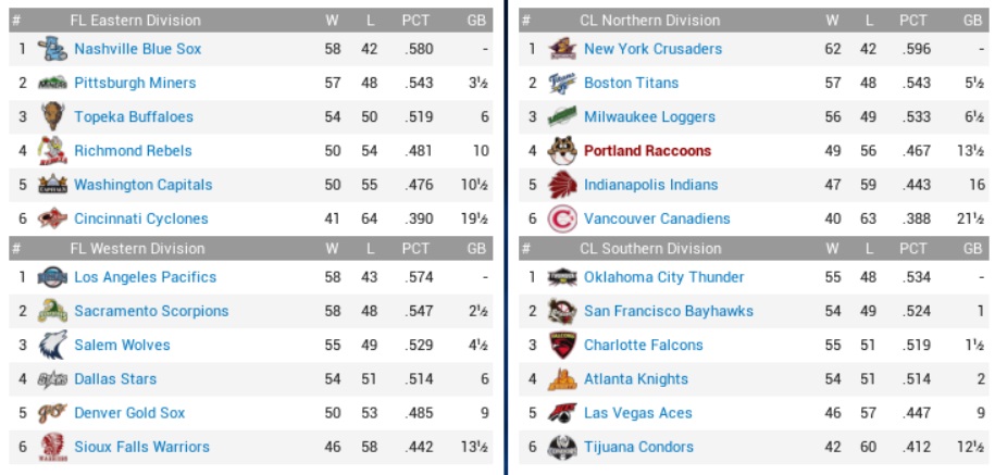 Raccoons (56-68) @ Loggers (61-63) – August 19-21, 2058
