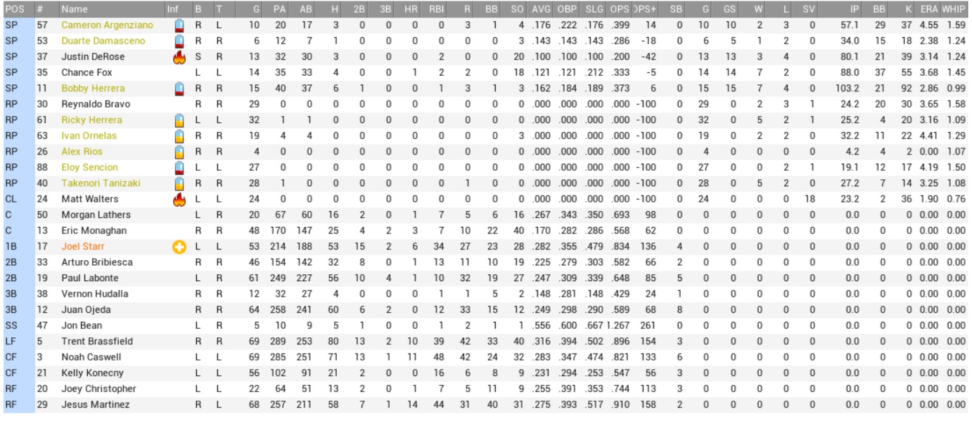 The Thunder’s Ed Soberanes was the big man in the All Star Game, driving in four runs in the CL’s 7-0 win over the FL at Raccoons Ballpark, doing so with an RBI single and a 3-run homer. Joel Starr started the game at first base, while Noah Caswell and Jesus Martinez appeared as pinch-hitters, then remained in the game. Collectively, those three Raccoons went 0-for-6 in their own den. Bobby Herrera pitched a scoreless third inning, and once I get a hold of the ******* that let Matt Walters pitch THREE INNINGS for the save, I will tear his *** all the way up to his ******* *************. Lock the gates, Maud! Lock them!! Raccoons (44-45) vs. Canadiens (37-52) – July 17-20, 2059 Not a lot had changed for the damn Elks since last week in Elk City. Fourth in runs scored, tenth in runs allowed, a -45 run differential, and they had been swept on the weekend before the All Star Game by the Titans, none of the games having been particularly close. We were up 5-3 in the season series. Projected matchups: Chance Fox (8-3, 4.16 ERA) vs. Andy Overy (7-6, 3.54 ERA) Justin DeRose (3-5, 3.57 ERA) vs. Jeff Kozloski (5-8, 3.43 ERA) Bobby Herrera (8-7, 3.13 ERA) vs. Anton Jesus (5-8, 5.41 ERA) Duarte Damasceno (2-5, 3.60 ERA) vs. Bill Lawrence (7-6, 3.95 ERA) We would only get one of the Elks’ southpaws, and it was Overy right at the beginning of the set. Game 1 VAN: LF D. Garcia – 3B Whittington – 1B J. Campos – CF D. Moreno – 2B Younce – RF Magnussen – C Burnham – SS E. Solano – P Overy POR: LF Christopher – 2B Ortega – 1B Brassfield – CF Caswell – RF Martinez – 3B Ojeda – C Monaghan – SS Benitez – P Fox The Raccoons put their first three batters past the break on base with singles, and – lo! – scored them all with the aid of a 2-run double by Caswell and after Martinez walked a run-scoring 4-6-3 double play by Ojeda. Monaghan whiffed. None of it mattered, since Chance Fox remained atrocious and had all his four limbs plucked from his body in the third inning in which the Elks scored four runs after a leadoff walk drawn by Danny Garcia, a Jose Campos single, and with two outs, Mark Younce’s RBI single and Adam Magnussen’s long, long 3-run homer. While he fooled his way into the sixth inning, giving up nine hits, the Raccoons never got another base knock to add to the four from the first inning. After many an inning of futility, Paul Labonte drew a leadoff walk in the #9 spot in the bottom 8th, was forced out by Christopher, and the runner was then caught stealing. It took all the way to the ninth inning to get Trent Brassfield to hit a leadoff single over Edwin Solano and those change that 4 on the board into a 5. Too bad it was still a 4-3 deficit after scoreless relief from Bravo, Tanizaki, and Sencion. Cas grounded out, Martinez popped out, and Starr grounded out to fritter that away, too. 4-3 Canadiens. Brassfield 2-3, BB; Game 2 VAN: LF D. Garcia – 3B Whittington – 1B J. Campos – CF D. Moreno – 2B Younce – RF Magnussen – C A. Maldonado – SS E. Solano – P Kozloski POR: RF Christopher – 2B Labonte – CF Caswell – LF Brassfield – 1B Starr – SS Bean – 3B Ojeda – C Lathers – P DeRose In the middle of three soggy outs, the Raccoons took a lead in the bottom 1st again with a Labonte triple and Cas’ RBI double, both to right-center, but with DeRose pitching, the tying run was never far away. While the Coons’ starter managed to face the minimum the first time through the Elks’ array of hooves and horrors, Danny Garcia then quickly dispelled the façade of competence and homered well deep to right to begin the top 4th, tying the game at one. Just like on Thursday, the Raccoons were unable to pull a base hit out between their furry cheeks forever and ever after the first inning, although the Elks decided to tempt fate in the bottom 6th by nicking Christopher to begin the inning. This time he stole second base, then reached third on a wild pitch while Labonte was still in the box. Go-ahead run on third base and nobody out, could we please find some rinky-dink position player to get one to bloop in? That would actually be a yes, because Labonte hit his second gap triple of the game, then scored on a balk. Brass also reached base, but then we began to run out of talent. Somehow, it still was enough. The Elks poked around DeRose’s wet nose for seven innings without getting him to roll on his back and wince for mercy like every other team would, and then had even less going against a pair of southpaws in Ricky Herrera and Matt Walters in the last two innings. 3-1 Coons. Labonte 2-2, BB, 2 3B, RBI; DeRose 7.0 IP, 5 H, 1 R, 1 ER, 2 BB, 7 K, W (4-5); Game 3 VAN: LF D. Garcia – 3B Whittington – 1B J. Campos – CF D. Moreno – 2B Younce – C A. Maldonado – RF Aragon – SS E. Solano – P A. Jesus POR: LF Christopher – 2B Labonte – CF Caswell – 1B Starr – RF Martinez – SS Bean – 3B Ojeda – C Monaghan – P B. Herrera Thomas Whittington singled, stole second, got another base on Monaghan’s throwing error, and then scored on a sac fly to Martinez while I was plotting how to best throw both our sucking catchers through a solid brick wall with the least amount of effort. The Raccoons responded in their inning of the week, the bottom 1st, which they also ran themselves out of when Christopher and Labonte were on to begin the inning, but Christopher was thrown out in a double steal. Cas then drove home Labonte from second to tie the game and Starr found a double play to roll into. Now, Bobby Herrera was just off. He had four 3-ball counts (but only one walk) in the second inning, and the fourth was similarly muddled, not least because Alex Maldonado reached second base to begin it with Labonte’s bad throw that skipped past Starr for an error. Both Juan Aragon and Danny Garcia drew walks off Herrera as the inning dragged on, but he struck out Whittington to leave the bases stranded. He was already over 80 innings 