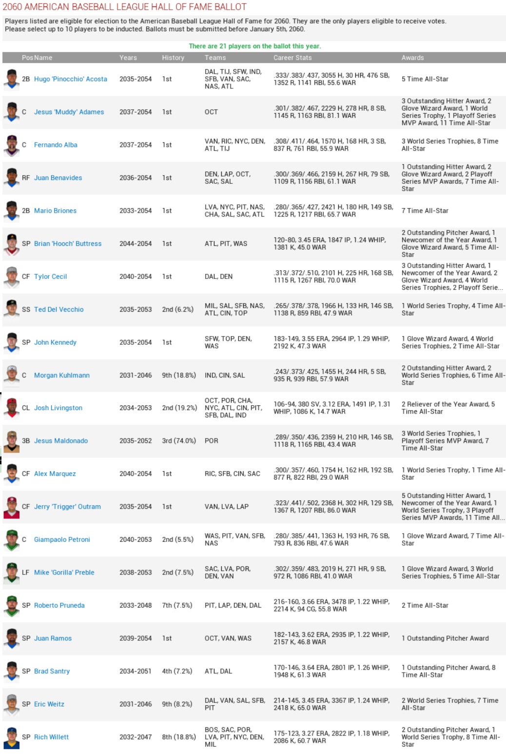 December 25 – The Raccoons sign reclamation project SP Tyler Riddle (53-38, 2.99 ERA) to a $2.8M deal for 2060. The 28-year-old former Logger has not pitched since August of 2058. December 27 – Sacramento adds ex-TIJ LF Tim Duncan (.255, 152 HR, 671 RBI) on a 3-yr, $8.88M deal. December 31 – 36-year-old C Jose Cantu (.276, 188 HR, 903 RBI) will be on his fifth FL team in 42 months on Opening Day after signing a 2-yr, $9.92M deal with the Gold Sox. He played for the Blue Sox, Caps, Miners, and Pacifics in the last three seasons. January 1 – A 4-year-deal worth $27.6M puts ex-TOP C Matt McLaren (.282, 181 HR, 622 RBI) on the Crusaders. January 4 – The Raccoons add two right-handed relievers in one go, signing former Pacifics MR Ryan Sullivan (50-50, 3.15 ERA, 141 SV) and former Wolves MR Ruben Mendez (47-50, 3.50 ERA, 174 SV). The 30-year-old Sullivan receives a 3-yr, $4.4M contract, while Mendez, age 33, joins for $2.8M over two years. January 4 – The Bayhawks trade SS Eric Cirelli (.268, 6 HR, 53 RBI) to the Gold Sox for CL Bill Goda (24-28, 3.99 ERA, 18 SV). January 7 – The Loggers send infielder Bill Sostre (.272, 31 HR, 142 RBI) to the Pacifics for OF James Wilks (.231, 5 HR, 29 RBI). January 9 – 38-year-old 1B/LF/RF/3B Mike Harmon (.267, 195 HR, 895 RBI), most recently with the Thunder, signs a 2-yr, $5.5M contract with the Scorpions. +++ Much improved pitching staff! Riddle fills out the rotation nicely, although there was still upgrade potential around Justin DeRose. The two veteran right-handers, both former closers, meanwhile would effortlessly extend tough-as-nails qualities into the seventh and eighth innings *and* got the Raccoons closer to have a bullpen entirely consisting of pitchers whose given names started with R, joining Ricky Herrera and Reynaldo Bravo. Good times! Together with what was left of the old bullpen – Walters, Ricky “Wins” Herrera, and Bravo for sure, and maybe Rios? – that left one spot for either another left-hander or a long man, or maybe both. For left-handers, we still had three options on the roster in Adam “Peppers” Harris, Elijah LaBat, and Nick Brown Memorial Pick Brad Loveless. Not enough has been said to praise Loveless, which is perhaps up to par for his name, but he made 30 mostly clean appearances out of the pen after the unlikely call-up after three earlier appearances in June. Yes, the walks were up, but somehow he still managed to avoid damage for the most part, and struck out 24 batters against 17 walks. Not awful for a 24-year-old 11th-rounder, but would that be enough to make the Opening Day roster? If we went for a long man on the roster, then there were plenty of options in Damasceno, Sensabaugh, and Colby Bowen (snickers). Since there were only $3M left in budget space, we would not spend any more on bullpen upgrades, so the last spots in the pen would be filled from what we already had on paw, especially since we still needed a third baseman, a right-handed outfielder and a backup catcher that could beat Cortez Chavez, a bar so low you could step over it. If we did not want Ben Morris to waste his youth on the bench, then we needed even two outfielders, although one of them might be Kozak or even Todd Oley. The addition of Nick Fowler took one spot away from the crop of mostly awful middle infielders we had accumulated in recent times. Contracts for ex-Coons: Victor Salcido took $1.92M from the Blue Sox; Harry Ramsay joined the Caps for $840k; +++ 2060 HALL OF FAME VOTING No fewer than five new players would join the Hall of Fame in 2060, including four that were on the ballot for the first time! 5-time Player of the Year Jerry Outram topped the table with the highest vote share (98.3%). Not only did he win MVP honors five times, he also won six batting titles, and eight times in his career led the league in OBP and OPS. The menace won Rookie of the Year honors in 2036 and spent the first 18 years of his career with the Canadiens before a couple of hangers-on gigs in the mid-2050s. Outram was sent to the All Star Game 11 times, won 10 Platinum Sticks, and a World Series championship with the Canadiens in 2038. A rare combination of high batting average, strong power, and for a long time at least solid defense in rightfield, Outram terrorized the CL North in particular with a career .323/.441/.502 slash line, collecting 2,368 hits, 302 home runs, and 1,207 RBI. He also stole 129 bases. Dallas outfielder Tylor Cecil didn’t have the longevity, but he sure had the week, winning three Player of the Year awards in the Federal League. Debuting with the Stars at 21, he spent a decade with that team before joining the Gold Sox, but then had his career unraveled by persistent injuries, and didn’t manage to put a qualifying season together after age 31, and retired when he was 35. Three times he led the Federal League in RBI and slugging, and once won the home run crown with 38 home runs in 2047. He took home the 2040 Rookie of the Year award, two Gold Gloves, four Platinum Sticks, and four World Series rings, one with the Stars and three with the Gold Sox. Jesus Adames was a career Thunder, appearing for them in 18 seasons, although that included two with just one or two appearances. When he was a roster mainstay, he would catch up to 144 games a year, and often challenged for the batting title, without ever winning it. He took home a home run title in 2043, though, and twice led the CL in slugging and once in OPS in the mid-2040s. A three-time Player of the Year, Adames was a regular at the All Star Game, with 11 appearances there, and won seven Platinum Sticks and two Gold Gloves along with a championship in 2053, his final season as a regular. He hit for a career slash of .301/.382/.467 with 2,229 hits, 278 home runs, 1,163 RBI. Hugo Acosta played in the league for 20 seasons, starting with a decade in Dallas white before tingling through eight different cities in the second decade of his career. A stick-firs