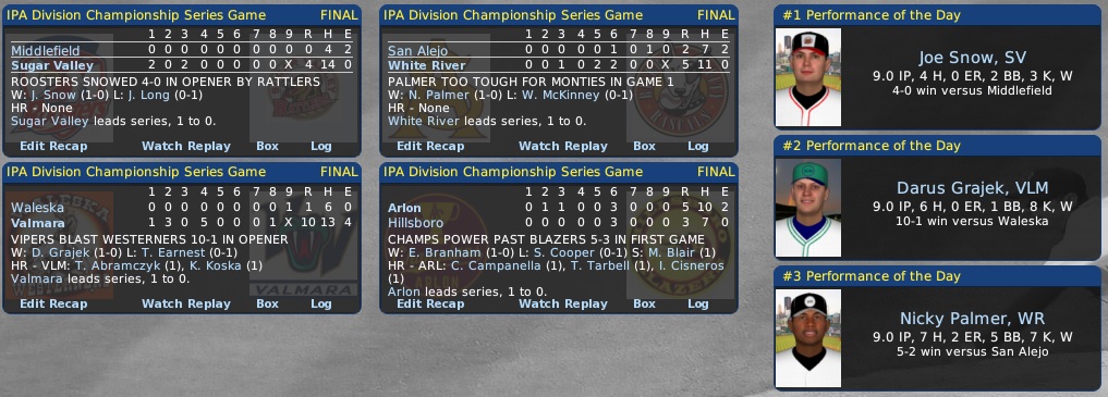Tuesday, September 26, 2051 IPA DIVISION CHAMPIONSHIP SERIES: Game 5 Ruthlandian Union SV RATTLERS ADVANCE TO RUTHLANDIAN LCS The Sugar Valley Rattlers rattled the boards for 17 hits on the way to their fourth win in five games to dispose of the Middlefield Roosters in the Ruthlandian Division Championship Series... the Rattlers rocked the Roosters 7-4 in game five and advanced to the Ruthlandian Union title game against the survivor of Valmara and Waleska. CF Carl Ramsey (.480) and 2B Richie Fry (.478) had four hits apiece with Ramsey driving a pair of runs and SS Ron Moody (.125) getting a pair of hits and two RBIs... Antonio Cedeno (1-1/3.26) and closer Davey Brennan (0-0/2 saves) combined for the win... Cedeno was the winning pitcher and worked into the seventh, allowing four runs on six hits, but only one was earned... He went to the showers with a 6-4 lead... Brennan got the save with two and one-third scoreless frames... loser Carroll Collier (1-2/1.45) started for the Roosters, but was relieved in the fourth after permitting two unearned runs and six hits... relievers Hollis Dale and Ken Willis followed Collier, but neither were effective... Middlefield only managed four hits for the day with SS Jimmy Beach (.238) going 2 for 4 and batting in a pair of runs. Middlefield manager Ricky Tinker lamented his lack of offense and defense. "You can't win if you don't hit and you don't win when you play lousy defense... 10 errors in five games is terrible... Sugar Valley only had three." Tinker added, " Our pitching was fine... the team ERA was 1.73... Sugar Valley didn't get one home run in the series... we were good enough to win most series except for our terrible fielding." Sugar Valley skipper was happy with his club's performance... "We only got 18 runs in the series, but it was enough... timely hits, solid pitching and strong defense saved us... but we will have to do better in the next round... the bats will have to be better." WALESKA STAVES OFF ELIMINATION, WINS GAME 5 The defending Pro Cup champ Valmara took a 2-1 lead into the last of the seventh of game five of the Ruthlandian Division Championship Series, but couldn't finish off scrappy Waleska Westerners... the Vipers' bullpen caved in and lost it 4-2... the Westerners got clutch performances from starter Lou Carlson and closer Vince Gibson and remained alive in the series though still trailing three games to two. Carlson held the Vipers to two runs on six hits in seven innings and Gibson closed out the win with by retiring six men in a row over the final two frames... Carlson (1-0/2.77) posted his first win of the best-of-seven series and it was Gibson's (0-1/0.00/2 saves) second save. Valmara starter Primo Sirak tired and departed after six innings ahead 2-1... Sirak gave up only one run and seven hits... losing pitcher Mirko Musial (1-1/2.16) was roughed up for two runs and three hits in just two-thirds of an inning and blew the save... Waleska tacked on an insurance run in the eighth against Mark Polaski. The Westerners collected 11 hits and were sparked by 2B D'Andre Doroncelay (.222) with two hits and two RBIs... CF Kenny Hardy's (.400) triple tied the score in the last of the seventh and Duroncelay followed it with an RBI single to put Waleska in the lead... they added another run in the eighth on a double by Hershel Briggs (.250)... the Vipers got only six hits with C Karol Koska's RBI groundout in the fourth and RF Boyd Holmes RBI single in the sixth accounting for their runs. Tycobbian Union STILLWELL SAVES THE BLAZERS WITH 1-0 WIN Down three games to one in the best-of-seven Tycobbian Division Championship Series, little-used Robby Lee Stillwell saved the favored Hillsboro Blazers from postseason elimination with a superb 1-0 shutout of the Arlon Champions... Stillwell was the surprising starter for manager Andy Jefferson and he came through for him... Stillwell (1-0/0.00) blanked the Champs on four hits, striking out five and walking four... he outdueled Arlon superstar Lanny Gray (1-1/0.56), who limited the Blazers to just one run and seven hits in seven innings... Gray had six Ks and walked only one batter... during the regular season Stillwell (0-0) made only 18 appearances, all in relief, but was very effective with three saves and a sparkling 1.69 ERA... his start came about because game two of the series was rained out and messed up the starting rotation. Hillsboro scored the game's only run in the top of the second... singles by 1B Ernie Moxley (.304) and RF Sidney Elmore (.273) placed runners on the corners... with one away Moxley scored on 3B Ken Joost's (.100) sacrifice flyout to center field... Moxley and 2B Bob Foster (.227) both socked three singles to lead the Blazers, who got eight hits. WHITE RIVER KNOCKS SAN ALEJO OUT OF PLAYOFFS The big bats of the White River Rascals were out in force with 17 hits as they knocked San Alejo out of the postseason playoffs with a 9-5 shellacking in game five, giving the Rascals the TU Division Championship Series four games to one... three Rascals, Billy Joe Hickman, Ryan Byrd and Ruben Reaves, all went deep to finish off the Montaneros for the season. After falling behind 3-0 after two innings, White River went to work on five San Alejo pitchers by scoring eight unanswered runs to take an 8-3 lead in the eighth... 2B Byrd (.250) had two hits and three RBIs... LF Hickman (.217) and 1B Reaves (.208) both drilled two hits each and batted in two runs... but the biggest hit output came from SS Kunta Burton (.500) collecting four hits and 3B Kenny Yarbrough (.440) with three... the Rascals only got decent pitching from winning pitcher Butch Slattery (2-0/3.60) and closer Ronald Doss (0-0/3.60/2 saves)... Slattery permitted three runs and seven hits in six frames, fanning seven and walking four... Doss allowed two runs and four hits in three innings for his second postseason save. RF Erik Landau (.458) paced the Monties with a solo homer among his four hits... CF Pablo