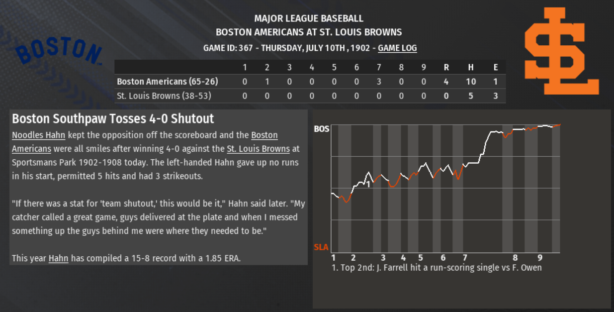 An outstanding pitching performance by Noodles Hahn, as he led the Boston Americans (65-26) to a 4 to 0 victory over the St. Louis Browns. Hahn (15-8) allowed just 5 hits and 1 walk for a Game Score of 79. Frank Owen (10-12) took the loss after giving up 4 runs (3 earned) on 10 hits and 2 walks; Game Score of 53.