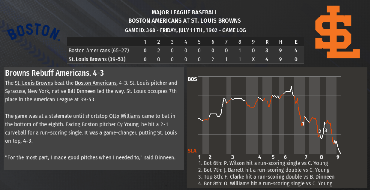 The 5-game win streak came to an end, as the St. Louis Browns (39-53) outlasted the Boston Americans (65-27) by a score of 4 to 3. Bill Dinneen (8-15) was solid in his outing, allowing 3 earned runs on 9 hits and 2 walks on 148 pitches; Game Score of 57. Cy Young (17-4) took the loss after allowing 4 runs (2 earned) on 9 hits to finish with a Game Score of 55.