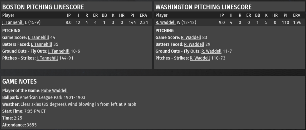 A masterpiece of a game by Rube Waddell led the Washington Senators (42-51) to a 4 to 0 victory over the Boston Americans (65-28). Waddell (12-12) scattered 4 hits and 1 walk as he cruised to the complete game shutout; Game Score of 83. Jesse Tannehill (15-9) was tagged with the loss after allowing 4 earned runs on 12 hits and 1 walk on 144 pitches; Game Score of 44.