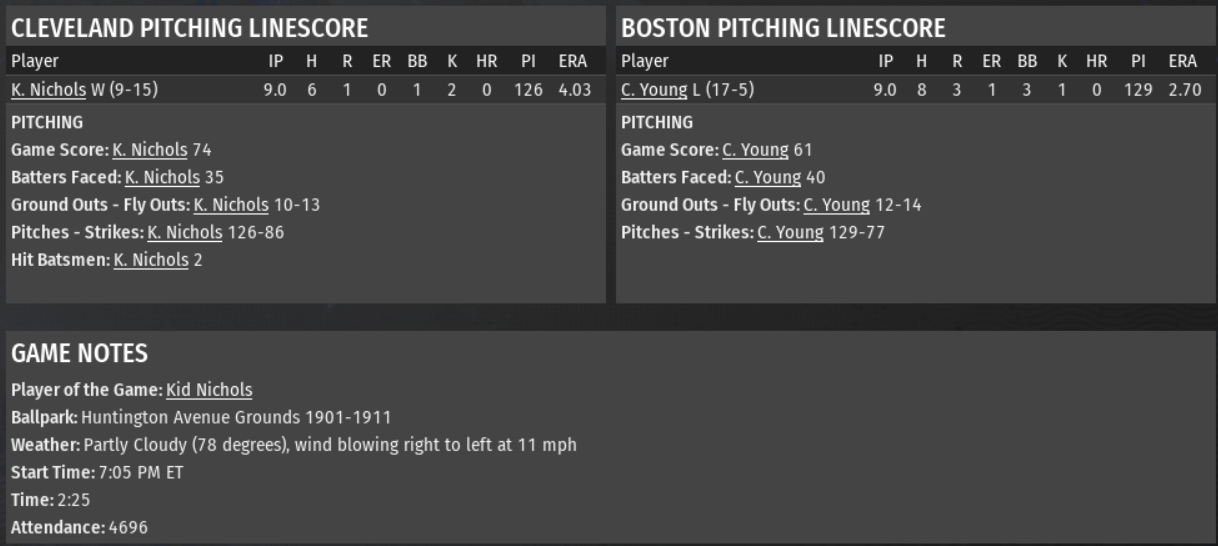 Cleveland starter Kid Nichols (9-15) limited the opposition to just 1 unearned run on 6 hits, 1 walk, and 2 hit batsmen to finish with a Game Score of 74. Cy Young (17-5) was solid in his outing but did allow 3 runs (1 earned) on 8 hits and 3 walks for a Game Score of 61. The offensive stars for the Bronchos included Lew Drill (2 for 5, Triple, 1 Run, 1 RBI) and Ed Delahanty (1 for 4, 1 Run, 1 RBI, 1 Walk), while Boston was paced by Bill Lange (2 for 3, Triple, 1 Stolen Base) and Frank Chance (1 for 3, 1 RBI). Player of the Game: Kid Nichols