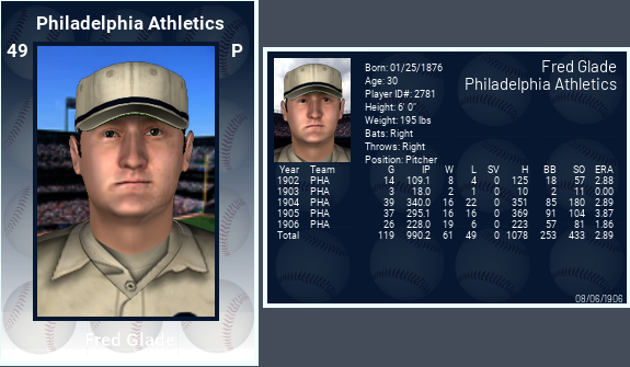 Here in Australia, we don’t have baseball cards, we have football cards. Our two main codes are Rugby Union in the northern states and Australian Rules in the southern part of the country (although both are now more national in nature). When I was a kid, Scanlans was the only card brand that mattered. They were to boys of the 1970s and 80s what Barbie dolls were to girls. Now, I’m not sure if the same phenomenon exists for baseball cards when buying them by the pack (the only way you could buy them back then, never as a complete set unless someone had collected it and were selling it as such), but there were always certain football players whose cards were far more common than others when you unwrapped that oily paper, stuck the piece of gum in your mouth and scoured the contents you’d just spent your pocket money on. Got it, need it, need it, got it was like a mantra for the card-collecting kid. OOTP’s selection process for Random Debuts and Rookies from All Eras seems to operate on the same principle. Some players seem to be in EVERY save you start up. Fred Glade, for me at least, is one of those players who falls into this category. Not just in saves such as this, where – given he played in this era IRL – one would expect him to, but modern ones as well. So, like George Stone and Harry Lumley before him, my interest was piqued. Fred Glade was born into a wealthy industrial family of German origin in Dubuque Iowa on January 25, 1876, before moving to Nebraska as a young boy, where his father Henry bought his first mill. When not working at the family business, Fred and his five brothers loved to play baseball, and all six Glade boys were quite talented at the sport. Fred, however, was the best of them, and he would leave the mill for months at a time to indulge his baseball passion. Fred played for various professional teams between 1898 and 1901, ending up at Des Moines of the Western League. His 1901 performance, in which he led the league with 196 strikeouts, sparked the attention of some major league clubs, and in early 1902 Des Moines sold him to the Chicago Cubs for $500. After joining the squad late and then impressing Chicago manager Frank Selee in his first few games, Fred promptly went home without telling the club or even his teammates. This would be a recurring theme throughout his career: Fred pitched when Fred wanted to. After serving out a suspension, Fred re-joined the club and on May 27 he made his major league debut at age 26. In a far from auspicious start to his career in the bigs, Fred gave up eleven runs, eight earned, thirteen hits, walked three and hit a batter, immediately putting an end to his career in Chicago. Selee, no longer impressed, sold him to St. Joseph, Missouri. Glade made his first start for his new club on June 4 and finished the year there, pitching in 24 games for the Western League club. He played the entire 1903 season as well, with his brother Phil also on the roster, pitching in 32 games and batting .279 in 104 at bats. That September, he was drafted by the St. Louis Browns. Glade turned in a stellar rookie season in 1904 with an 18-15 record in 35 games, the most by a Browns rookie in club history. He and fellow rookie pitcher Barney Pelty posted 33 combined wins, more than half the club’s total victories, and his 15-strikeout effort against the Senators on June 19 set the American League record until Rube Waddell broke it in 1908. Glade posted a 2.27 ERA in 1904 and tossed six shutouts, three in September. So pleased were the Browns with their new find that they turned down an offer of $5,000 for him from the pennant-winning Red Sox. Perhaps they should have offloaded him, because 1905 was no banner year for the club or Fred individually, as he went 6-25 and the Browns finished in the cellar. That said, Fred’s 2.81 ERA was only marginally above the league average of 2.65, and 11 of his losses were by one run. He rebounded somewhat in ’06, going 15-14 with a 2.36 ERA, but then – after getting married in the offseason – went on another one of his sabbaticals. After not making his first start until a month into the 1907 season, Fred ended up going 13-9. But he was no longer happy at St. Louis, and pushed for a trade to Clark Griffith’s Highlanders club in New York. The Browns eventually relented and Fred started the ’08 season with his new club in fine spirits, even reporting on time for once. But it wasn’t to be, as an unclarified stomach ailment – reports put it down to causes as varied as malaria,the lingering effects of Bright’s disease, or the result of drinking tainted milk. In total he started only five games for the Highlanders, losing four, before falling out magnificently with his manager and going AWOL. Not long after, Griffith himself resigned. Despite numerous assurances to new skipper Kid Elberfeld that he would soon return to the club, he never did. After signing a contract with the Highlanders in February 1909, Glade simply never fronted. A purportedcomeback in 1910 never eventuated. Reports suggest that the Highlanders continued to offer Glade a roster spot for years to come, despite the fact that he was in his late thirties. Fred returned to the family business, and became the company’s President after the death of his father in 1910. The company still exists today, and prosperously so, with such popular brands as Banquet, Chef Boyardee, Healthy Choice, Hunt’s and Libby’s, to name a few. Fred, sadly, does not. He passed away in November 1934 after a long illness. He was just 53. In the Footnote League, Fred is reborn. He joined the Philadelphia Athletics upon joining the league in 1901 and is still there. After a brief stint at the club’s PSL side at Shreveport, Fred was promoted to the bigs and is putting together a fine career indeed, with 61 wins against 49 losses and an ERA of 2.91. 1906 has been his best season yet, as he has already amassed 19 wins while losing only 6 and his 1.8