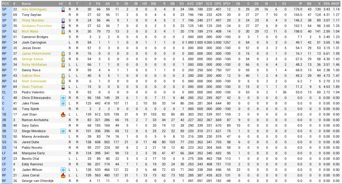 The Raccoons needed wins and the Bayhawks looked like they were ready to give them away. They were tenth in runs scored, and fourth in runs allowed. The season series was even though – we needed the offense bubbling against a team that was 20 games out in the South, which had of course already been taken by the Thunder. Projected matchups: Girolamo Pizzichini (6-9, 3.53 ERA) vs. Kelly Whitney (8-17, 4.42 ERA) Alex Dominguez (16-7, 3.61 ERA) vs. Juan Sanchez (8-12, 4.84 ERA) Vinny Morales (9-4, 3.12 ERA) vs. Preston Young (14-7, 2.76 ERA) Sanchez, a former Critter, was the only southpaw. After this series, we would have our final day off. Game 1 SFB: CF Parrish – 3B J. Chavez – LF Streng – RF J. Ward – C H. Valdez – 1B McEwan – 2B Bruce – SS Leggett – P Whitney POR: SS Duhe – CF Wilson – 1B Starr – LF Early – C Flowe – 3B Mendoza – RF Colter – 2B Archuleta – P Pizzichini The day began with a home run by John Parrish, and then Joel Chavez and Ian Streng knocks that put two runners in scoring position before Pizza somehow turned that around, struck out Jake Ward and Hugo Valdez, and got a grounder to third base from Jim McEwan to end the inning. Duhe reached on an error in the bottom 1st, but was doubled off by Starr. The Raccoons seemed to gain traction in the bottom 3rd with singles from Colter and Archuleta to lead off, but then Pizza couldn’t get a bunt down and instead struck out. Duhe singled, but that one now only loaded the bases and invited hope for more good things to come, but Wilson grounded into a force at the plate before Starr snuck a 2-out, 2-run single up the middle to flip the score after all. Early then flew out to Parrish in deep center. McEwan then homered the game tied again in the fourth, and Pizza bunted into a force play his next time around, at which point I felt a bit like I had just been handed a slice topped with nothing but olives… Pizza held on to the 2-2 score through the end of the seventh inning, but had to settle for a no-decision since the Raccoons just couldn’t get going against Whitney, who was still going in the bottom 8th, nicked Jaden Wilson, but the runner then was caught stealing… and the Raccoons went down calmly afterwards. Both Josh C in the eighth and Nava in the ninth allowed a hit to the Bayhawks, but no run to score, and so Whitney was still trying to punch his 18th loss of the season as the bottom of the ninth began with Flowe batting. He singled and was run for with Arredondo, who was caught stealing, and the Raccoons fecklessly had the game drift into extra innings. Pedro Valentin struck out the side in the tenth before Ramon Archuleta hit a leadoff triple into the left-center gap against right-hander Roland Wiser. Eddy Ramirez batted for Valentin, but popped out on the infield. Duhe was not pitched to, but Wilson ended the game with a clean single to center. 3-2 Critters. Wilson 2-4, RBI; Flowe 2-4; Archuleta 3-4, 3B; Pizzichini 7.0 IP, 7 H, 2 R, 2 ER, 1 BB, 5 K; The Titans beat the Thunder, 4-3, and so the gap remained one game. The Crusaders and Elks took losses against the Knights and Aces, respectively, and with both of them now 4+ games behind it looked like the 5-way race might be narrowing down. Game 2 SFB: CF Parrish – 3B J. Chavez – LF Streng – RF J. Ward – C H. Valdez – 2B Bruce – 1B Navarre – SS Leggett – P Ju. Sanchez POR: SS Duhe – CF Ramirez – 1B Starr – LF Early – 3B Mendoza – RF van Otterdijk – 2B Archuleta – C D’Alessandro – P Dominguez Dominguez hadn’t won a game in a while, and giving up leadoff extra-base hits didn’t seem like a way that would readily facilitate a win, but the Bayhawks also failed to score after the leadoff doubles the Parrish hit in the first, and Joel Chavez in the fourth. Dominguez struck out five in as many innings and allowed no runs, while the Raccoons had the bases loaded in the bottom 1st when van Otterdijk grounded out, and got Duhe and Ramirez on base in the third inning before a wild pitch helpfully moved them into scoring position. Joel Starr hit a sac fly to bring in the game’s first run, and Marquise Early added an RBI single to go up 2-0, but was ultimately left on base by … van Otterdijk. The Bayhawks’ John Parrish then drew a leadoff walk in the sixth and Diego Mendoza mishandled Chavez’ grounder for an error, and Dominguez’ stuff wasn’t enough to get off scoff-free this time. Streng grounded out, Ward hit an RBI single, but then Valdez and Ryan Bruce both whiffed to keep two on base, and the Raccoons up by one, but another hapless inning in the bottom 6th was followed by a sneaky leadoff single by Nate Navarre and then a Wally Leggett homer brushing the foul pole on its way out, flipping the score to 3-2 Baybirds. Dominguez was lifted – no W again! – but was taken off the hook in the bottom 7th with a Jared Duhe homer that tied the game. Ramirez also reached base, leading to Sanchez’ removal for righty Billy Thompson. Starr doubled and Early walked to fill the bases, bringing up Mendoza. Thompson ran the count full against him, and then threw a pitch inside that might have brushed Mendoza’s sleeve, but was ball four anyway and nobody started a discussion. This forced in the go-ahead run. Colter batted for the listless van Otterdijk, but flew out to right just the same. The lead was blown with a major blackout from Jesse Dover, who hit the leadoff man Streng with a 1-2 pitch in the eighth, then balked the pinch-runner Mario Flores to second. Ward flew out, but Hugo Valdez’ infield single put runners on the corners, and Bruce tied the game with a groundout up the middle. Navarre also grounded out to Duhe to end the inning. The Raccoons filled the bases again in the bottom 8th on … three walks issued by Thompson to Archuleta, Duhe, and Ramirez, bringing up Starr, and the raking continued with a tie-breaking, 2-out, 2-run single to left! Early grounded out, and McMahan got the ball for
