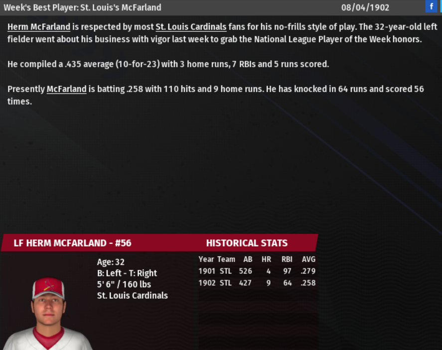 Not the most-likely player to take home an award, but St. Louis Cardinals outfielder Herm McFarland put together a fine string of games to take home the National League Player of the Week award. In picking up the honors, McFarland went 10 for 23 (.435 batting average) with 3 Doubles, 3 Homeruns, 5 Runs, 7 RBIs, and 1 Walk to finish with a slash line of .435/.458/.957 that resulted in a 319 OPS+ and 0.7 WAR.