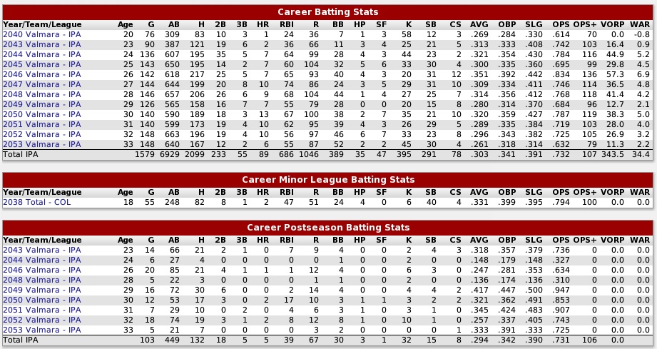 Monday, April 6, 2054 Islandian Pro Alliance Fifth All-Decade Team (2041-2050) SS: Ken Jensen (2040-2053) The decade's top shortstop is still active at age 33... Ken Jensen has sparked his Valmara Vipers to 9 pennants and 3 Gold Cup trophies ('43, '49, '50)... he's a 2-time Ruthlandian All-Star... 4-time Golden Glover... and a good, solid bat... his career BA is .304 with 91 homers, 733 RBIs and 1097 runs scored... Jensen has stolen 291 bases... has played well in the postseason appearing in 103 games, batted .294 with 132 hits, 5 homers, 39 RBIs, 67 runs and 40 stolen bases. Jensen was selected in the All-Decade poll because of the success of the Valmara Vipers in the playoffs... second in the voting was LaGrange's fine shortstop John Rodgers (2038-2053)... 5-times Ruthlandian All-Star... 3-time Golden Glove... but his club never made the playoffs... lifetime Rodgers batted .292 with 330 HRS, 1289 RBIs and 1284 runs scored... still playing very well at age 36. Number three in the shortstop rankings is Sam Essex of the La Claire Lynx (2039-2053), who retired this year at age 34... in his career he was a 4-time Tycobbian All-Star... Golden Glover... but rarely made the postseason... appearing only one time in his last year of play as backup infielder and pinchhitter... Essex got his one and only Pro Cup ring this season when La Claire copped the IPA crown... in 5 games he hit .600 with 2 RBIs and 2 runs scored... for his career Essex hit .268 with 360 home runs, 1234 RBI and scored 976 runs. Last edited by Eugene Church; 11-04-2015 at 07:31 PM. |