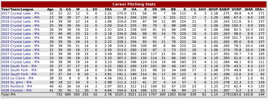 SP: Duncan Welch (2017-2036) The number three man in the IPA 50th Anniversary All-Stars' rotation is Duncan Welch, who chalked up 350 wins and 255 losses in his 20 seasons in the IPA and compiled an impressive 2.78 career ERA... 4 times he was an All-Star, winning the RU Most Valuable Player trophy twice, in 2020 and 2023... 3 times he garnered the Golden Arm, in 2019, 2020 and 2023... 7 times the Crystal Lake Crushers won pennants and hauled in 2 Pro Cups (2020 and 2022)... Welch was also chosen for the Third Decade All-Stars (2021-2030). Welch, the 6' 7" southpaw, ranked 7th in the Islandian Pro Alliance in wins with 350... the stringbean lefty also was brilliant in the postseason with a marvelous 17-5 mark in 28 games with a fine 2.50 ERA. Twice Welch was named the Pro Cup MVP in 2020 and 2022. Last edited by Eugene Church; 06-24-2020 at 01:24 PM. |