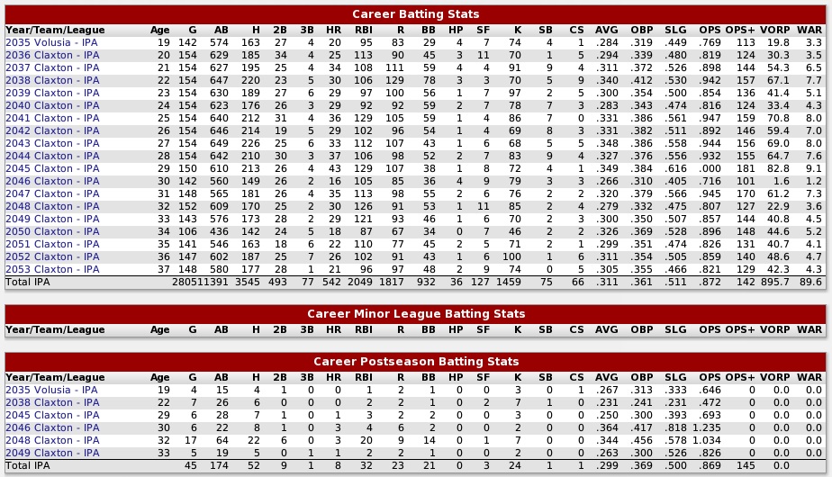 John Velasco (2026-2049) Not only was second sacker John Velasco durable, playing for 24 years in the Islandian Pro Alliance, all for the Fairfax Frogs, but he was talented, too... a 9-time All-Star... with 4056 hits, second on the all-time list next to the great first baseman Phil Gravelli with 4260, who played mainly for Belair Beach and Crystal Lake, 2001-2025... Velasco was still a very good ballplayer even in his last season at age 42... he batted .320 with 18 HRs and drove in 73 runs in '49... overall, Velasco hit .299 with 2026 RBIs and 2071 runs... in the IPA he's 8th all-time in RBIs and 7th in runs scored... however, Velasco starred for a run-of-the-mill Fairfax team and made the playoffs just twice... still he was really "Mr. Reliable", playing at a good level year in and year out... Velasco was overwhelmingly voted into the IPA Hall of Fame in 2049... he was also honored as the best second baseman on the Fourth Decade All-Star Team. Alan Hansen (2001-2023) One thing you could say about Hansen... he was definitely a winner... he played for two teams in his 22 seasons and was a vital part of their success. He was with the Bayview Vikings for five years and finished up with the powerhouse Turon Typhoons. Hansen helped the Vikings win two pennants and make the playoffs four times. But it was with the Typhoons where he really excelled. Hansen spurred them to 10 pennants in his 17 seasons. Turon won two Pro Cups 2009 and 2018 and lost in the Finals in 2010 and 2017... Hansen was twice named to an All-Decade team, the first one and the the second one... overall in 3287 games (5th best all-time) Hansen had a career .296 BA, 3554 hits (9th all-time), 149 triples (7th all-time), 2262 runs (1s all-timet), 2351 walks (2nd all-time) and stole 725 bases (5th all-time). He only struck out 554 times in over 12,000 at-bats. Hansen played in 135 postseason games, compiled a .309 batting average, had 159 hits, 31 doubles, scored 89 runs and stole 32 bases. He was chosen for the All-Star team four times and won a couple of Golden Gloves. Last edited by Eugene Church; 12-28-2015 at 10:52 PM. |