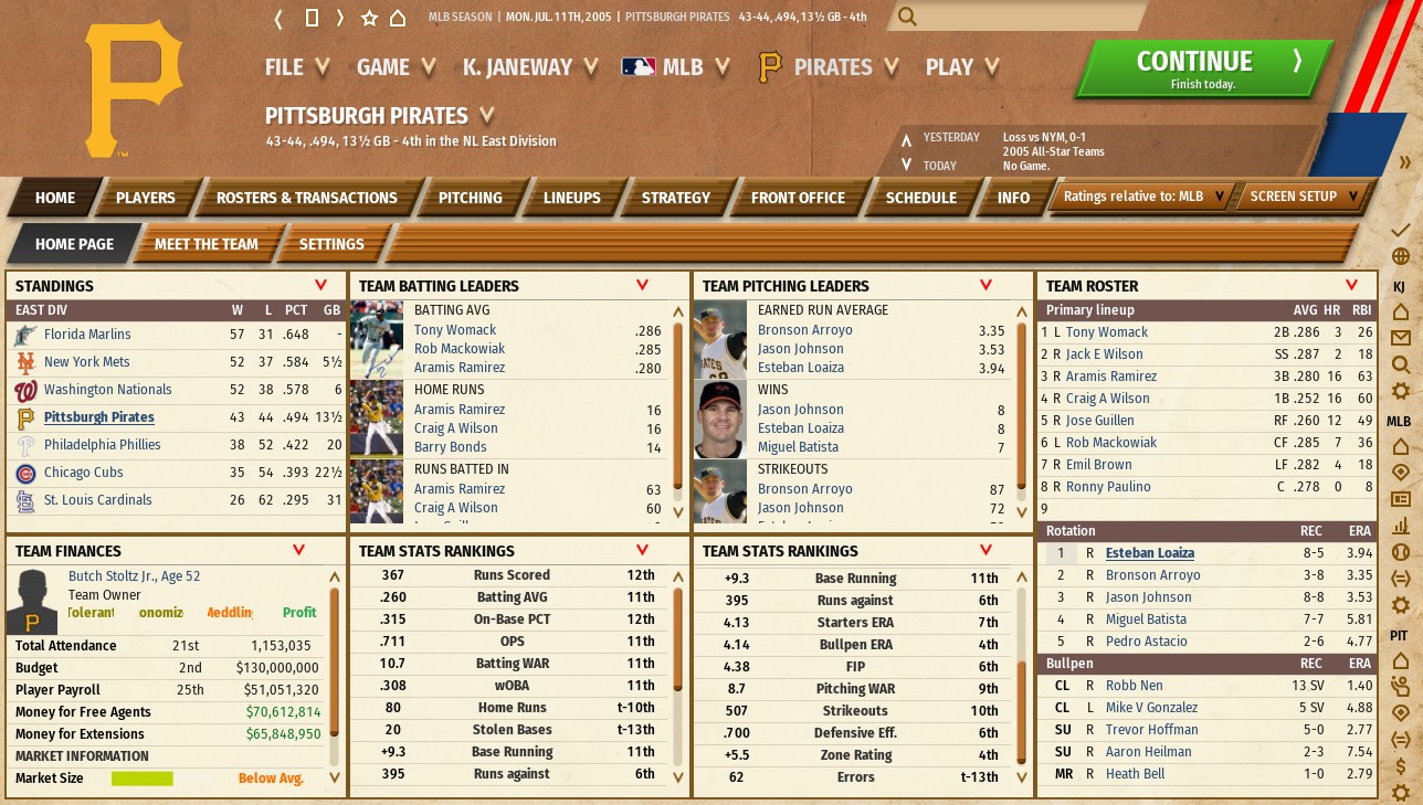 I should explain why Bonds is still a Pirate in 2005. Bonds has asked for long term contracts and sometimes for less than market. In 1989, his first arbitration year, he signed for ten years starting at $1m going up to $1.9m for 1998. People who have played this era realize salaries increased a lot during these years and Bond's salary doubling during this time didn't come close to matching the market increases. This is evident from his next contract which started at $8.5m in 1999. That was a five year deal that increased to $9.6m before dropping to $9m in 2005. The starting figure was a bit under market but without huge increases became a deal as average salaries increased. Memory is that Bond made the list of 25 highest paid players twice, although it might be three times. But he was one of the top ten performers most of these years. In 2006, for the first time, Bonds wants to be the highest paid player in baseball. Demand has varied during the season but has never been less than $29m. The Pirates 2005 payroll ranked 23rd (beginning of season) in MLB at $52m. With a goal of keeping the payroll in the bottom third signing Bonds for anywhere close to his demand doesn't work. It was nice having Bonds for so long. But if I play the Bonds years again, I hope he bolts after six years so I can have a different experience. Last edited by Brad K; 02-16-2023 at 04:38 PM. |