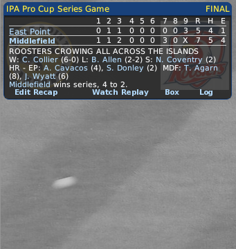 Monday, October 7, 2052 IPA PRO CUP SERIES: Game 2 at Middlefield Park in Middlefield COLLIER EVENS PRO CUP FINALS AT 1-1 In the second game of the Pro Cup Finals at Middlefield Park, the Middlefield Roosters hit the ball well, pitched well and played good defense... and the Pro Cup favorite tied the series at one game each with an 8-1 drubbing of the East Point Panthers... Chris Collier (5-0/1.52) won his 5th game of the playoffs, stopping the potent Panthers on seven hits... his Rooster teammates smacked 13 hits and were paced by 2B Rupert Forbest (.370/6 RBI), SS Stan Radzikowki (.242/5 RBI), RF Rufus Blackburn (.208/8 RBI) and CF Johnny Wyatt (.259/14 RBI) each with two runs batted in... Wyatt hit his 4th homer of the postseason and Forbest had four hits... Benny Allen (2-1/4.55) caught the loss, going six frames and giving up five runs on seven hits... East Point splits the first two games on the road and will now take on the Roosters at Armed Forces Park in the next three games... if necessary, the last two games will be in Middlefield. Last edited by Eugene Church; 02-02-2017 at 03:53 PM. |