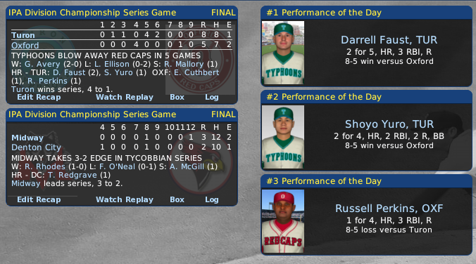 Sunday, September 28, 2053 ROOSTERS ADVANCE, SWEEP WYNNAMAC Down three games to none Wynnamac never had a chance in game four... the reigning Pro Cup holder Middlefield massacred the Sundowners 10-1 to sweep the RU Division Championship Series... James Long (2-0/0.00) was touched for nine hits, but Wynnamac only got one run of of him and it wasn't even earned... Long went the distance for the second time in the series, struck out five batters and walked no one... mighty Middlefield, favored to take its second straight IPA crown, pounded out 15 hits in the rout with RF Rufus Blackburn (.500) going 3-4 with three runs and three RBIs... 1B Bubby Cranmore (.267) and SS Stan Radzikowski (.250) both garnered three hits and scored a pair of runs... the Roosters will now take on the Taranto- Waleska winner for the Ruthlandian title and the right to play in the Pro Cup Finals against the champion of the Tycobbian Union... Blackburn was hurt flagging down a deep fly ball... no word yet on how serious it was... his loss would put a huge damper on the Roosters repeating as Pro Cup titlist... not too many teams can replace a player who hit 45 home runs and batted in 114 runs. Sundowner skipper Jerry Meeks told reporters, "All you hear about is how good the Roosters hit the ball... well, they have some pretty darn good pitchers, too... Long is something else... all we could get off him was one run in two games... we didn't much better against Dale and Wheelhouse... 7 runs in 4 games... it's hard to win that way." The Roosters posted a superlative 1.46 ERA... but the batters did their job, too... they talled 21 runs, hit 5 out of the park and batted .276 for the series against a strong Sundowner staff... Sammy Hayes (23-14/2.26), Simon Northcutt (22-10/2.50) and James Duncan (15-14/2.79) have pretty strong credentials. Middlefield manager Ricky Tinker praised his whole squad... "the last five years have been special... these guys do it all... we just need to play well in the next series...actually we may have to play better... you know as well as I do, the teams get better with each round."... the Roosters have captured five pennants in a row in the Ruthlandian West Division. TARS HEAD TO RU TITLE SERIES The top two picks to win the Pro Cup trophy this year will tangle with each other in the Ruthlandian Union League Championship Series... the #2 pick Taranto Tars blew away the Waleska Westerners in four games in first-round action and will now test the top pick and Pro Cup favorite, the Middlefield Roosters... it's a repeat of last year's Ruthlandian Finals which was won in a stirring 7-game series by the Roosters on the way to the IPA title. To get to the next level in the playoffs, Friday afternoon Taranto eliminated Waleska with a 4-2 triumph in 10 innings at Westerner Field... 1B Phil Wilson snapped a 2-2 tie with an RBI single and Dan Armistead tacked on an insurance run with a sacrifice fly... Louie Toscano (1-0/0.00) recorded the victory with two runless frames and Lou Carlson (0-1/5.40) was pinned with the loss... both clubs blew quite a few opportunities to blow the game open... Waleska outhit the Taranton 14 to 12 and also stranded 13 runners to 11 for the Tars... RF Cody Losby (.450) sparked Taranto with two hits, including a two-run homer, his 3rd in the series... Wilson (.375) and Armistead (.294) each had three hits in the game. "Great pitching and home runs can take you a long way in the playoffs."... Those were the words of Augie Marshall, the triumphant skipper of the Taranto Tars... "The starters were sensational... so was the bullpen... and they had to be... otherwise we would be heading home for the winter... Waleska was in every game... I know it was a sweep, but three games were decided by one run... the fourth one by two runs... and two of them went extra innings." Roy Hobbs, the Waleska manager, spoke in a similar vein to reporters... "A few hits here and there and we would still be playing... it wasn't as one-sided as you might think." Taranto held the Westerners to just two runs a game... the Tars' ERA was a standout 1.71 for the four games. TURON TRIPS OXFORD, UP 3-1 IN SERIES In game four at Winchester Park in Oxford, favored Turon tripped up the Red Caps 8-5, topping them with a pair of two-run homers... C Doyle Ashcroft (.471) and LF Darrell Faust (.167) both went deep for the Typhoons, who now have a huge three games to one bulge in the best-of-seven Tycobbian Division Championship Series... Ashcroft batted in four runs with a pair of hits... Turon rapped out 11 hits to 9 for Oxford... both clubs had their aces on the hill, but neither performed like it... Nate Scottsdale (1-1/6.14) staggered to the win... the Red Caps ripped him for five runa and nine hits in his eight and two-thirds innings... Dickie Parmenter came in with the bases loaded and got the final out... Rudy Mellancamp (1-1/5.06) didn't fare very well, either... the Typhoons slammed him for seven runs in seven innings... so much for the pitching duel... it was Turon's third straight triumph... all they need is one more win and they have three games to do it... with the final two at home at Typhoon Stadium. MIDWAY TIES DC AT 2 GAMES APIECE Game four of the Tycobbian Division Championship Series went to the Midway Wolves 5-1 over the Denton City Redbirds... playing on the road at Douglas Denton Field, Beau McCloud and Jeffrey Leonard combined on a two-hitter to even up the series at two game apiece... winning pitcher McCloud (1-0/1.42) started and worked into the 7th when his control left him... he only permitted one hit and one run, but walked five batters... Leonard relieved and put down the Redbird threat... he blanked the Redbirds over the final two and two-thirds inning on one hit for the save... the Wolves collected nine hits and dealt the defeat to Flash Stringfellow (1-1/1.93), who held them to two runs - one earned - in seven frames... Midway jolted the Denton City bullpen for three runs in the top of 
