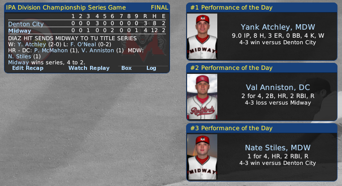 Tuesday, September 30, 2053 DIAZ HIT SENDS MIDWAY TO TU TITLE SERIES Game 6 was a thriller-diller at Joe Wolf Stadium in Midway... finally decided in the bottom of the 9th on CF Ernesto Diaz's (.185) ground single to right that scored 2B Del Holloway (.523) from second base with the winning run... the Wolves whipped Denton City 4-3 to cop the series four games to two... Diaz also got the game-winning hit in game five... Yank Atchley (2-0/3.00) hurled a solid game, holding the Redbirds to three runs on eight hits with four Ks and no walks... Midway had 12 hits with 3B Nate Stiles (.125) getting a two-run homer... Denton City 1B Val Anniston (.286) hit a two-run shot and LF Paul McMahon a solo clout, both in the 4th frame... the defeat went to reliever Freddy O'Neal (0-2/7.36), who came on in the last of the 9th... O'Neal also was the loser in yesterday's game... Midway will now make their way to the Tycobbian League Championship Series against the Turon Typhoons... the winner of the best-of-seven set will get a spot in the IPA Pro Cup Finals. Hall-of-Fame pitcher and Midway manager, Bobby Dorignac, was estatic, telling reporters, "For the first time in 27 years we have made the playoffs... I don't want to count my chickens too soon, but this team has what it takes to take our first Pro Cup trophy... we still have to win two more tough series, but this team can do it... we got the pitching and the clutch hitting to do it. Downcast Denton City skipper Pete Gibbs went straight-to-the-point... "You got to give it to the Midway staff... they are something special... starters and bullpen.. just might be the best in the IPA...we couldn't score runs... you can't win if you don't score runs... 18 runs in 6 games won't cut the mustard." Last edited by Eugene Church; 04-05-2017 at 09:28 PM. |