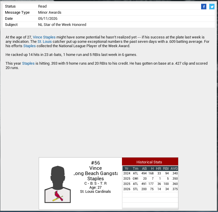 Notes: Staples and Snyder raking Keeran makes news Marks pitching his behind off so far STL super team needs Seyde to get hot...that team scares me when it finally puts it together. |