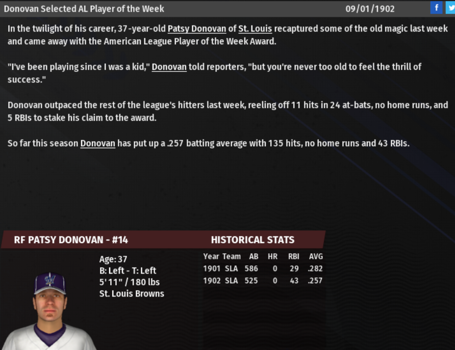 Nearing the end of his playing career, St. Louis Browns outfielder Patsy Donovan showed that he still had something left in the tank, as he strung together a fine hitting week to take home American League Player of the Week honors. In picking up the award, Donovan batted .458 (11 for 24) with 4 Runs, 5 RBIs, 2 Doubles, and 2 Walks for a slash line of .458/.500/.542 which was good for a 215 OPS+ and 0.5 WAR.