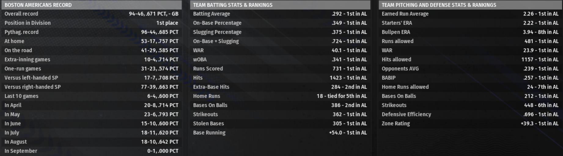 Now the regular season is over, wanted to share a snapshot of how the Boston Americans fared this season. As shown, it was a tremendous season in nearly all facets of the game. A few observations: an amazing home record and extra-inning games; a surprising lower than expected win % in 1-run games; very little power on offense; and a pitching staff that gave up the long-ball with few strikeouts far too often.