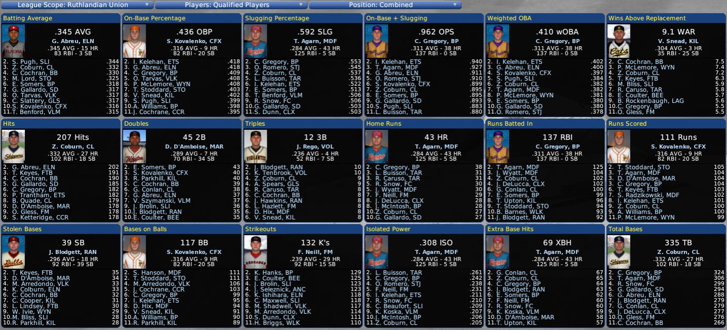 Wednesday, September 20, 2056 TARS OVERTAKE REDHAWKS IN RU NORTH The Taranto Tars (91-63) were the preseason favorite in the Ruthlandian North Division and the baseball pollsters were right... the Tars got hot down-the-stretch and whipped defending champ Far Mountain by 3 games... Taranto chalked up a 12-4 in September, while Far Mountain faded to 6-10... the Redhawks blew a 3-game margin in the final weeks of the campaign. Taranto's fine pitching led them to the RU North title with a impressive 2.96 ERA (1st)... offensively the Tars had very good firepower with 200 homers (1st), but they only hit .248 and were just average in scoring runs (18th-tied)... vets Freddy DeAngelis (22-7/2.61) and Valerio Rossi (20-11/2.54), Phil Castle (15-12/3.42) and Chris Gallo (16-14/3.51) were a solid starting rotation... the bullpen was good, too... defense was just average with a .974 FA... no great contact bats in the lineup, but Taranto had good power with RF Lenny Buisson (.275/31 HR/65 RBI/75 R/8 SB), CF Renzo Caruso (.233/31 HR/56 RB/64 R/17 SB), C Nicolo Parisi (.234/22 HR/69 RBI/54 R), 1B Kuma Toyota (.236/21 HR/69 RBI/46 R) and LF Dominick Sanna (.243/20 HR/60 RBI/71 R)... 9 players had 10 or more roundtrippers... the club just doesn't hit for much average, but they can go deep... the Tars got a good draw in the opening round of the Pro Cup playoffs... they will host lightly-regarded Waleska (86-68) and have a good chance to advance to the Ruthlandian Union League Championship Series against the survivor of the Middlefield Roosters (95-59) and the Eastshore Cotton Kings (92-62), two of the stronger clubs in the Ruthlandian Union... the Tars might be a factor in the postseason with its very good starting rotation and long-ball power... however, the bullpen could hurt their chances... lack of contact hitters, too. Second Place Far Mountain (88-66) took a turn for the worse late in the season and it cost them the division flag... they compiled a solid 3.35 ERA (4th) and had a better-than-average offense (12th), but only average power (14th)... defense just fair with .971 FA... the Redhawks had a solid rotation with Benny Van (21-14/2.98), Stan Smith (17-12/3.05), Eldon Bittner (15-13/3.68) and Frankie Frasier (10-8/3.37)... Brian Townsend (5-6/2.01/29 saves/49 G) was a standout closer... 1B/OF Ox Gless (.287/29 HR/88 RBI/98 R/24 SB) was the biggest threat and had a fine season... 2B Luke Hazlett (.305/10 HR/65 RBI/82 R/7 SB), LF Frankie Neill (.239/29 HR/92 RBI/82 R/15 SB) and CF Lew Aston (.268/23 HR/86 RBI/72 R/10 SB) also contributed to the offense... Far Mountain just picked a bad time to play poorly. It appears that the Ruthlandian North will belong to Taranto and Far Mountain for the next few seasons... none of the other teams in the division played winning ball and might be a few years away from pennant contention... LaGrange (73-81) came in a distant third, 18 GB... Rudy Barnett (12-9/3.19) and J. T. Dwyer (16-16/3.77) put up the best numbers for the starters... the bullpen was only mediocre with closer Rob Fullmer (6-10/3.99/30 saves)... the Sports only have so-so bats in the lineup... the best sticks are CF Bert Rockenbaugh (.280/13 HR/60 RBI), RF Sonny Ricard (.278/17 HR/67 RBI) and LF Robby Rousseau (.278/16 HR/68 RBI)... there are no real threats in the batting order. The Valmara Vipers (72-82) finished fourth in the standings, 19 GB... mediocre pitching, batting and fielding... aging vets topped the twirlers: 33-year-old Darus Grajek (16-12/3.26) and 37-year-old All-Star Primo Sirak (16-14/3.38)... no one special in the bullpen, either... C Karol Koska (.254/24 HR) was the most productive bat with some help from Vladimir Szymanski (.294/16 HR) and 1B Timmy Benford (.315/23 HR)... looks like it's time for Valmara to rebuild. Fifth place went to the Ranford Bulls (71-83)... just a lackluster club... superstar Ralph Hawk (13-15/3.63) really showed his age at 38 this year and is rumored headed for retirement... he has carried the club for almost 20 years with a 351-195 career record... Hawk was 21-12 in '55 with a 2.20 ERA... Martin Futch (7-6/2.05/24 saves/44 G) is the only mound talent to speak of... all-around talent All-Star LF Jedd Blodgett (.296/18 HR/92 RBI/98 R/39 SB) showed good progress in his sophomore season at age 22. The Glasco Athletics (68-86) were forecast to seriously challenge for the division crown... the A's were the second choice for the pennant, but it never happened... they never contended at all, going 6-20 in April and wound up tied for sixth place with Ancona... Monte France (17-14/3.85) is a fairly good starter... not a lot of offense... fair hitters in 2B Ross McFalls (.272/26 HR/87 RBI), CF Callum Slattery (.317/13 HR/83 RBI/78 R/13 SB) and 3B Allen Spears (.302/8 HR/65 RBI/82 R/8 SB). The Ancona Red Elephants (68-86) were picked sixth in the preseason poll and wound up right there... 21-year-old rookie hurler Yanni Bubas (16-12/3.69) did well this year, but didn't have much help... Chet Sheldon (4-5/1.63/19 saves/37 G) was another youngster who did well in the closer spot... Ancona just has a few average bats, but nothing special... best of the lot is LF Franco Briganti (.295/17 HR/69 RBI), CF Horace Nickens (.285/12 HR/69 RBI/18 SB) and 2B Jason Seleznick (.249/20 HR/76 RBI). For the third straight season the Kilkenny Cats (65-89) came in last in the RU North, 26 games behind pennant winner Taranto... Kilkenny is one of the IPA worst franchises with just one postseason appearance back in 2043... Billy Joe Wooster (16-18/3.27) is a quality starter, along with Carroll Hudsmith (17-12/4.07)... and 22-year-old Willie Tobin (1-4/1.23/16 saves/45 G) showed well in the bullpen this year... CF Vance Snead (.304/3 HR/35 RBI/98 R/25 SB) and SS Rex Parkhill (.284/5 HR/68 RBI/72 R/28 SB) are the best veterans... and 19-year-old 3B Tory Upton (.230/22 HR/98 RBI/74 R/6 SB) impressed with his power and production, but didn't hit much. Last edited by Eugene Church; 02-08-