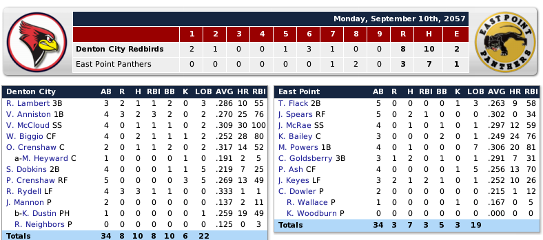 Monday, September 10, 2057 Ruthlandian South Division Waleska's Ethan Addy fired a four-hitter to shipwreck the Crystal Lake Skippers (82-66), costing them a chance to draw within a game of first place St. John (84-64) in the Ruthlandian South Division... Crystal Lake potent attack had no chance against the 22-year-old rookie... 18-year-old rookie hurler David Plant suffered the defeat... Javon Grammer led Waleska with a three-run double in the seventh frame... even though their chances are slimmer than slim, the Westerners (78-70) stayed in the pennant hunt with the victory. Last edited by Eugene Church; 05-13-2018 at 09:35 PM. |