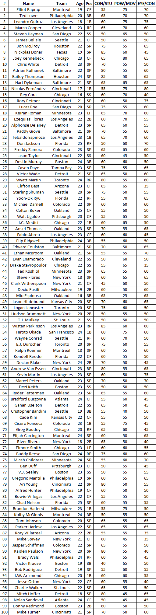 SP Derek Acuña (BOS) - 10-7, 3.29 ERA, 161.1 IP, 1.10 WHIP, 4.3 K/9, 4.0 WAR SP Parker Alvey (TB) - 11-6, 3.04 ERA, 162.2 IP, 1.23 WHIP, 5.1 K/9, 5.0 WAR SP Hasan Bustamante (SEA) - 12-6, 2.75 ERA, 173.1 IP, 1.25 WHIP, 3.1 K/9, 3.2 WAR SP Trent Johnson (DET) - 12-5, 3.46 ERA, 151.0 IP, 1.34 WHIP, 3.5 K/9, 4.0 WAR SP Rivaldo Quintanilla (MIN) - 10-6, 3.63 ERA, 148.2 IP, 1.49 WHIP, 3.6 K/9, 4.0 WAR (Injured) SP Jonah Taylor (NYY) - 9-7, 3.18 ERA, 164.0 IP, 1.31 WHIP, 3.8 K/9, 3.8 WAR CL Dante Creech (NYY) - 4-3, 18 SV, 2.27 ERA, 47.2 IP, 1.47 WHIP, 4.9 K/9, 0.8 WAR CL Simón Gutiérrez (MIN) - 1-1, 0.86 ERA, 21.0 IP, 0.90 WHIP, 2.6 K/9, 0.6 WAR CL Koy Luster (LAA) - 3-3, 27 SV, 2.22 ERA, 48.2 IP, 1.23 WHIP, 4.4 K/9, 1.0 WAR CL Lee Shoemaker (HOU) - 5-2, 22 SV, 1.28 ERA, 42.1 IP, 1.35 WHIP, 5.5 K/9, 1.0 WAR C Arnold Pedersen (KC) - .329/.375/.435, 310 AB, 4 HR, 123 wRC+, 2.5 WAR C Raimundo Teixeira (CLE) - .311/.360/.467, 302 AB, 7 HR, 1 SB, 125 wRC+, 2.5 WAR 1B George Healey (CLE) - .318/.391/.439, 358 AB, 8 HR, 2 SB, 120 wRC+, 2.4 WAR 2B Grant Borres (BOS) - .363/.398/.510, 292 AB, 2 HR, 6 SB, 147 wRC+, 3.3 WAR (Injured) 3B Andy Doering (BOS) - .318/.361/.466, 399 AB, 5 HR, 26 SB, 117 wRC+, 2.5 WAR 3B Kerry Law (TOR) - .351/.456/.523, 367 AB, 8 HR, 168 wRC+, 4.8 WAR SS Gilson Cravoa (CHA) - .315/.374/.450, 391 AB, 9 HR, 130 wRC+, 4.2 WAR SS Matthew Jiles (KC) - .342/.375/.459, 403 AB, 4 HR, 5 SB, 131 wRC+, 4.1 WAR SS Wilf Sayers (SEA) - .331/.376/.458, 299 AB, 4 HR, 1 SB, 122 wRC+, 2.6 WAR CF Zeke Gomez (LAA) - .305/.368/.403, 357 AB, 4 HR, 9 SB, 114 wRC+, 3.0 WAR CF Zach Pelczar (CLE) - .316/.370/.416, 392 AB, 4 HR, 17 SB, 115 wRC+, 2.8 WAR CF Beto Solorio (DET) - .317/.419/.444, 293 AB, 11 SB, 138 wRC+, 3.4 WAR CF Nick Valdez (TB) - .367/.414/.505, 218 AB, 3 HR, 9 SB, 158 wRC+, 2.6 WAR RF Tokichi Kawakami (TB) - .348/.412/.468, 325 AB, 2 HR, 30 SB, 144 wRC+, 4.4 WAR RF Arnold White (CHA) - .348/.410/.536, 371 AB, 12 HR, 5 SB, 157 wRC+, 3.8 WAR National League: SP Auggie Lee (CHC) - 14-6, 2.14 ERA, 168.0 IP, 1.17 WHIP, 4.6 K/9, 4.6 WAR SP Toro Limon (CHC) - 13-5, 2.52 ERA, 168.0 IP, 1.13 WHIP, 5.2 K/9, 4.5 WAR SP Elonzo Pedroza (SF) - 11-6, 2.80 ERA, 148.0 IP, 1.28 WHIP, 3.3 K/9, 3.6 WAR SP Reynaldo Rivera (ATL) - 12-3, 2.95 ERA, 170.2 IP, 1.23 WHIP, 2.5 K/9, 3.2 WAR SP C.C. Roberts (SD) - 13-5, 2.97 ERA, 154.2 IP, 1.23 WHIP, 5.8 K/9, 3.7 WAR SP Verne Rodriquez (ATL) - 11-8, 3.13 ERA, 167.0 IP, 1.26 WHIP, 3.1 K/9, 3.4 WAR CL Hernando Aquino (CHC) - 2-1, 28 SV, 1.47 ERA, 43.0 IP, 1.37 WHIP, 5.9 K/9, 0.9 WAR CL Salvadaro Fernández (SF) - 5-2, 19 SV, 3.07 ERA, 41.0 IP, 1.37 WHIP, 3.3 K/9, 0.9 WAR CL E.J. Haldeman (STL) - 2-1, 17 SV, 2.55 ERA, 35.1 IP, 1.73 WHIP, 4.1 K/9, 0.7 WAR CL Len Rice (COL) - 5-2, 22 SV, 0.93 ERA, 48.1 IP, 0.93 WHIP, 4.5 K/9, 1.8 WAR C Theodore Kenworth (MON) - .348/.406/.455, 279 AB, 5 HR, 139 wRC+, 3.1 WAR C Jeff Vasquez (LAD) - .381/.424/.510, 194 AB, 2 HR, 155 wRC+, 2.4 WAR 1B Sebastian Tremblay (ARI) - .323/.383/.442, 371 AB, 8 HR, 124 wRC+, 2.3 WAR 2B Huston Harmon (ATL) - .318/.353/.471, 365 AB, 1 HR, 11 SB, 126 wRC+, 2.8 WAR 3B Micah Lazenby (PHI) - .295/.329/.418, 380 AB, 6 HR, 2 SB, 103 wRC+, 2.0 WAR SS Tucker Emmanuel (NYM) - .273/.364/.395, 319 AB, 7 HR, 11 SB, 116 wRC+, 2.6 WAR (Injured) SS Lester Taylor (FLA) - .318/.341/.476, 424 AB, 4 HR, 9 SB, 120 wRC+, 3.0 WAR SS Scott Tyszko (ATL) - .301/.354/.396, 336 AB, 10 SB, 102 wRC+, 2.7 WAR LF Glenn Carter (SD) - .307/.338/.457, 361 AB, 3 HR, 5 SB, 109 wRC+, 2.3 WAR (Injured) LF Ethan Clark (ATL) - .293/.358/.459, 368 AB, 10 HR, 4 SB, 120 wRC+, 3.1 WAR LF Adrian Ellerman (ARI) - .341/.399/.521, 355 AB, 13 HR, 1 SB, 153 wRC+, 3.4 WAR CF Jax Slaughter (MON) - .298/.357/.441, 406 AB, 3 HR, 16 SB, 122 wRC+, 3.6 WAR CF Johan Velez (LAD) - .288/.402/.403, 372 AB, 6 HR, 19 SB, 129 wRC+, 4.1 WAR RF Joziro van der Walt (MIL) - .311/.389/.473, 376 AB, 8 HR, 16 SB, 139 wRC+, 4.2 WAR |
