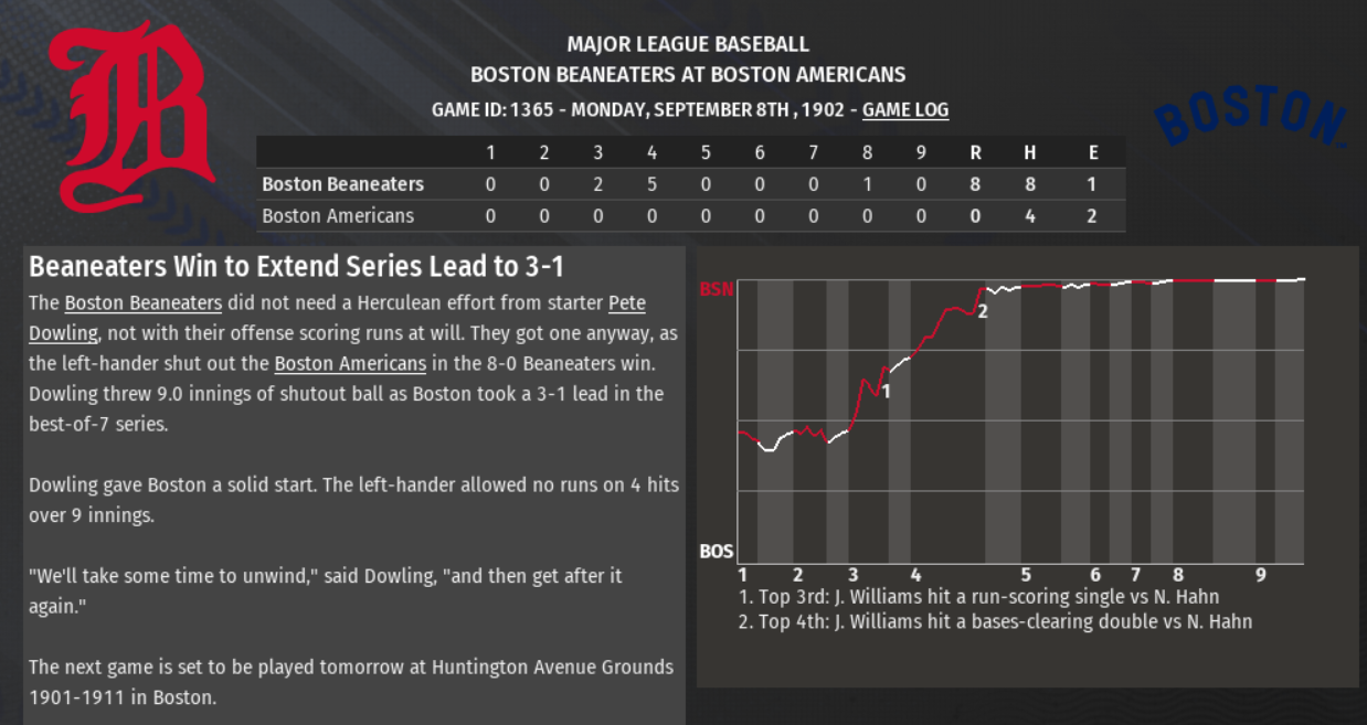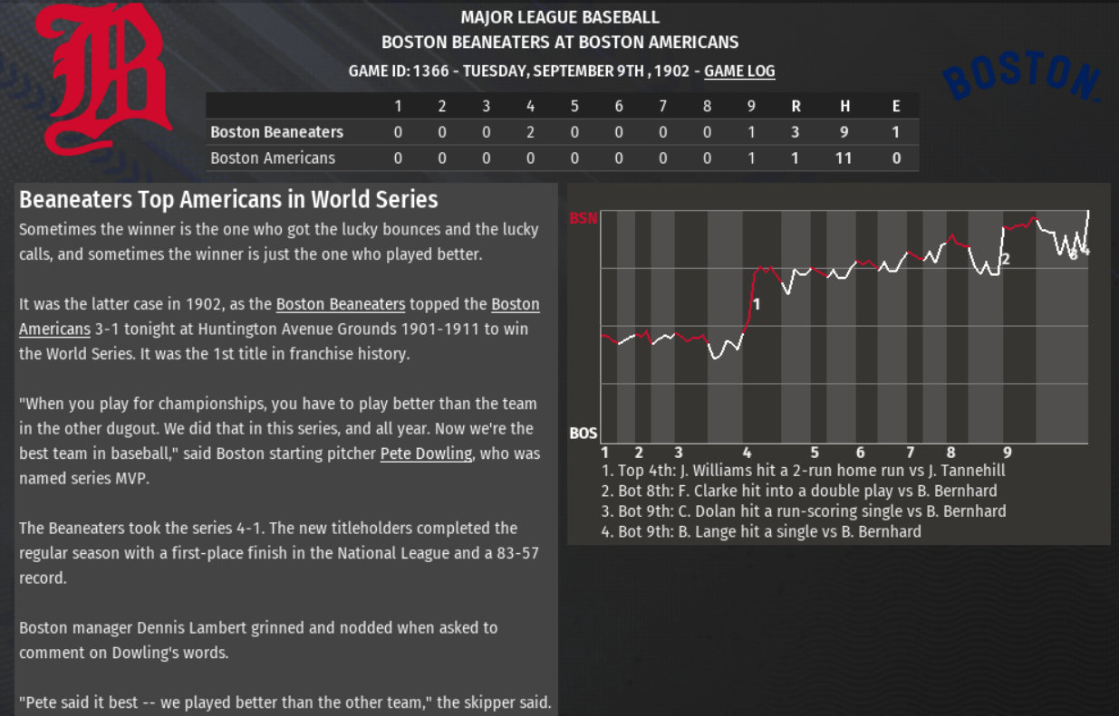 In securing their 1st MLB championship, the Beaneaters relied on the expert pitching of Bill Bernhard (2-0) who allowed just 1 earned run on 11 hits, 3 walks, and 1 hit batsman; Game Score of 61. Jesse Tannehill (0-2) was tagged with the loss after serving up 3 earned runs on 9 hits and 2 walks to finish with a Game Score of 58. Jimmy Williams (1 for 4, Homerun, 1 Run, 2 RBIs), Sammy Strang (1 for 3, Double, 1 Run, 1 Walk), and Jimmy Ryan (2 for 4) led the way on offense. Bill Lange (2 for 4, 1 Walk), John Farrell (2 for 3), and Cozy Dolan (1 for 1, 1 RBI) played well in the loss. Player of the Game: Bill Bernhard Series MVP: Pete Dowling