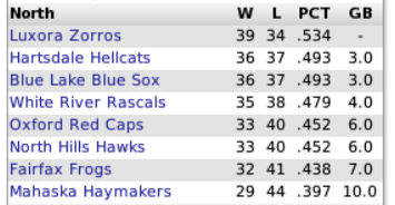 Wednesday, September 19, 2057 RED CAPS SOAR IN TU NORTH IN 2ND HALF The Tycobbian North Division was a humdrum affair for most of the year with barely any team playing winning baseball, but it was a very good pennant race... the eventual pennant-winning Oxford Red Caps didn't even reach the .500 mark until August... despite being the preseason favorite, the Red Caps played poorly the first half (33-40) and even trailed by 6 games at midseason, tied for the sixth spot in the standings... but then Oxford (88-66) kicked it into overdrive and went on a 49-23 spree and won the TU North by 7 games over runner-up North Hills (81-73)... third place went to the Luxora Zorros (80-74), 8 games out... and winding up in fourth were the White River Rascals (78-76), 10 games off the pace... the Rascals had won the division crown the previous three seasons... actually the TU North was quite a race... North Hills led at the end of April... Luxora took over at the All-Star Game... but the Z's faded in August and gave way to on-rushing Oxford... even also-rans Hartsdale and Blue Lake had their day in the sun during the year... the fifth-place Hellcats (74-80) and last place Blue Sox (72-82) were tied for second place at midseason. The Oxford Red Caps were redhot at the plate with a .270 BA and 257 homers and put a lot of runs on the scoreboard, topping the IPA with 839 runs... manager Dennis Hartwig had just enough pitching to get by... only two other clubs in IPA history had more roundtrippers than the Red Caps... Red Bluff set the all-time mark with 283 in 2045 and Arroyo Grande smashed 260 out of the park years ago in 2005... Oxford had 10 players with 10 or more homers... the Tycobbian Union had four fine ballclubs in the playoffs... each one of them could capture the Pro Cup this year. 1ST PLACE: OXFORD RED CAPS (88-66) Last Year: (78-76) (4 GB) (2nd Place) Two Years Ago: (82-72) (1 GB) (2nd Place) Last Postseason: 2052 and 2053 (1 Pro Cup - 2007) (8 Pennants) Manager Dennis Hartwig has a powerhouse attack and will have to be reckoned with in the playoffs... this is the Red Caps' third pennant in five years... they are poised and ready for bigger and better things in the IPA. Team Stats: .270 BA (7th), 839 runs (1st), 257 HR (1st), 4.23 ERA (27th), .978 FA (good) Top Pitchers: All-Star ace Maury Statler (26-10/2.94) led the IPA with 26 victories, tied with Tuckanarra's Ian Timms (26-5/2.24).... a big part of the Red Caps' success was rookie starter Meldon Eddington (17-11/4.14)... another rookie sparkled in the bullpen... Pat McFarlane (2-4/2.29 ERA/26 saves/44 G) was outstanding. Top Batters: Oxford has a scary lineup with bunch of bangers like rookie 1B Buddy Blackford (.285/41 HR/113 RBI/82 R), 3B Roland Latimer (.253/36 HR/90 RBI/75 R/2 SB), OF Frankie Beckwith (.303/34 HR/76 RBI/71 R/2 SB), LF Wade McGrew (.322/31 HR/73 RBI/74 R/3 SB), RF Ozzy Ackerman (.289/25 HR/71 RBI/66 R/9 SB), OF Dwayne Wagner (.255/21 HR/73 RBI/83 R/6 SB), SS Roger Bajon (.260/16 HR/62 RBI/80 R/6 SB), 3B Ethan Cuthbert (.300/14 HR/41 RBI/42 R/1 SB), C Giles Gilliam (.300/12 HR/46 RBI/67 R) and OF Raylan Theodore (.308/10 HR/33 RBI/35 R/3 SB)... slick-fielding rookie SS Scott Schneider (.269/7 HR/58 RBI/60 R/9 SB) also helped out with his bat, too. 2nd Place: North Hills Hawks (81-73) (7 GB) Last Year: (78-76) (4 GB) (3rd Place) Two Years Ago: (75-79) (7.5 GB) (4th Place) Last Postseason: 2045 (4 Pro Cups - 2034, 2036, 2038, 2041) (13 Pennants) The Hawks have Hall-of-Famer Dave Michael as skipper... He was the Pro Cup MVP twice (2034, 2038)... Michael posted a 315-234 record in his 19 seasons with the Hawks... he was marvelous in the postseason with a 20-13 mark and 2.32 ERA in 37 starts... Michael has led the Hawks to first-division finishes for five years in a row... they are back on track to being a contender in the TU North. Team Stats: .271 BA (6th), 695 runs (13th), 87 HR (32nd), 3.85 ERA (17th), .972 FA (poor) Top Pitchers: North Hills has a good starting rotation with Johnny Kristoff (20-15/3.56), Juan Cintron (15-15/3.68), Thad Vachon (11-8/3.99) and Zip Harben (11-16/3.73)... add into the mix rookie Eddy Salem (4-0/2.50), who stood out after joining the club in August... the Hawks' bullpen is in good hands with Bobby Antonio (7-3/1.54 ERA/19 saves/44 G). Top Batters: the Hawks suffer from a total lack of power... none of the regulars go deep very often... 3B Sam Dunstone (.307/2 HR/54 RBI/74 R/8 SB) and 1B Victor Bates (.316/7 HR/54 RBI/64 R/1 SB) are good contact hitters... the most productive bats are SS Pat Johnston (.268/1 HR/70 RBI/76 R/3 SB), 2B Don Shirley (.259/10 HR/60 RBI/61 R/3 SB) and part-timer LF Eddy Carlyle (.343/15 HR/45 RBI/32 R)... better run-scoring could do wonders for the Hawks. 3rd Place: Luxora Zorros (80-74) (8 GB) Last Year: (69-85) (13 GB) (7th Place) Two Years Ago: (81-73) (1.5 G) (3rd Place) Last Postseason: 2031 (No Pro Cups) (11 Pennants) Kent Halloran took charge of the Zorros back in 2052 and has them on the rise... this year the Z's had the league lead most of the time until August, but got blown away by the rampaging Oxford Red Caps in the last six weeks of the season. Team's Stats: .262 BA (12th), 733 runs (7th-tied), 173 HR (8th), 4.04 ERA (23rd), .980 FA (very good) Top Pitchers: Luxora has decent starters in Paolo De Freitas (17-17/3.53), Mack McKitrick (18-11/3.66), Jimmy Hollis (16-15/3.92) and Juliano Machado (14-13/4.21)... the bullpen is just mediocre... rookie Bartolo Baptista (7-7/3.69 ERA/25 saves/46 G) is the most reliable reliever. Top Batters: top performers on the team were LF Marvin Harrelson (.283/28 HR/86 RBI/76 R/6 SB), 1B Wade Tibbs (.279/22 HR/84 RBI/76 R), rookie 2B Ryo Nijo (.278/19 HR/59 RBI/72 R/4 SB)... backup rookie RF Omar Solis (.311/15 HR/55 RBI/59 R/1 SB) also put up some very good numbers. 4th Place: White River Rascals (78-76) (10 GB) Last Year: (82-72) (1st Place) Two Years Ago: (83-72) (1st Place) Last Postseason: 2056 (No Pro Cups) (11 Pennant