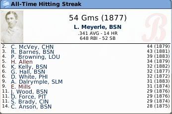 Levi Meyerle had a 54 game streak playing for Boston in 1877. ![]() Al Spalding had a 62-8 record in 1875 while playing on the 71-8 Boston team that year. Ironically, the real Boston club started 26-0 and mine started 24-0 that year. This is without recalc or anything on. Spalding recently got his 500th win, he currently has 508 to lead all players. ![]() -Abner Powell threw a no-hitter on 1885 Opening Day.