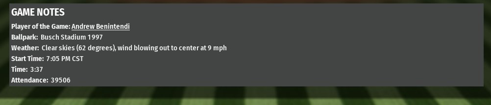 St. Louis fell behind 7-0 only to rally for a 9-8 win over Quad City at Busch Stadium (1997). The Thunder pounded River Walkers starting pitcher Luiz Gohara for seven runs over the first five innings to build its lead. Justin Turner had a three-run double to highlight a three-run second inning and Derek Fisher and Miguel Gomez had RBI singles in a two-run fifth. St. Louis used the long ball to chip away at the deficit. Michael Conforto led off the bottom of the sixth with a solo homer off Quad City starting pitcher Matt Ruppenthal. Adeiny Hechavarria added a two-run shot later in the inning, making it 7-3. In the seventh, Andrew Benintendi smacked a grand slam off reliever Jesse Hahn, and it was tied. The Thunder, however, retook the lead in the top of the eighth on a Drew Robinson homer off Grant Dayton. The Walkers responded right back, with two in the bottom half. Christian Arroyo with a pinch-hit RBI double off J.D. Hammer. Ender Inciarte then chased him him with the winning run by hitting a single. Gohara was not good, lasting just four innings and allowing seven runs on seven hits. But the bullpen was impressive allowing just that eighth inning run. Bobby Poyner pitched the fifth inning. Jake Diekman handled the sixth and seventh. Dayton pitched the eighth, allowing the Robinson solo homer. Tommy Kahnle worked around a single in the ninth for his sixth save. |